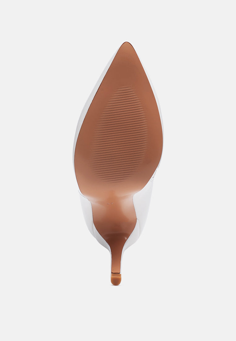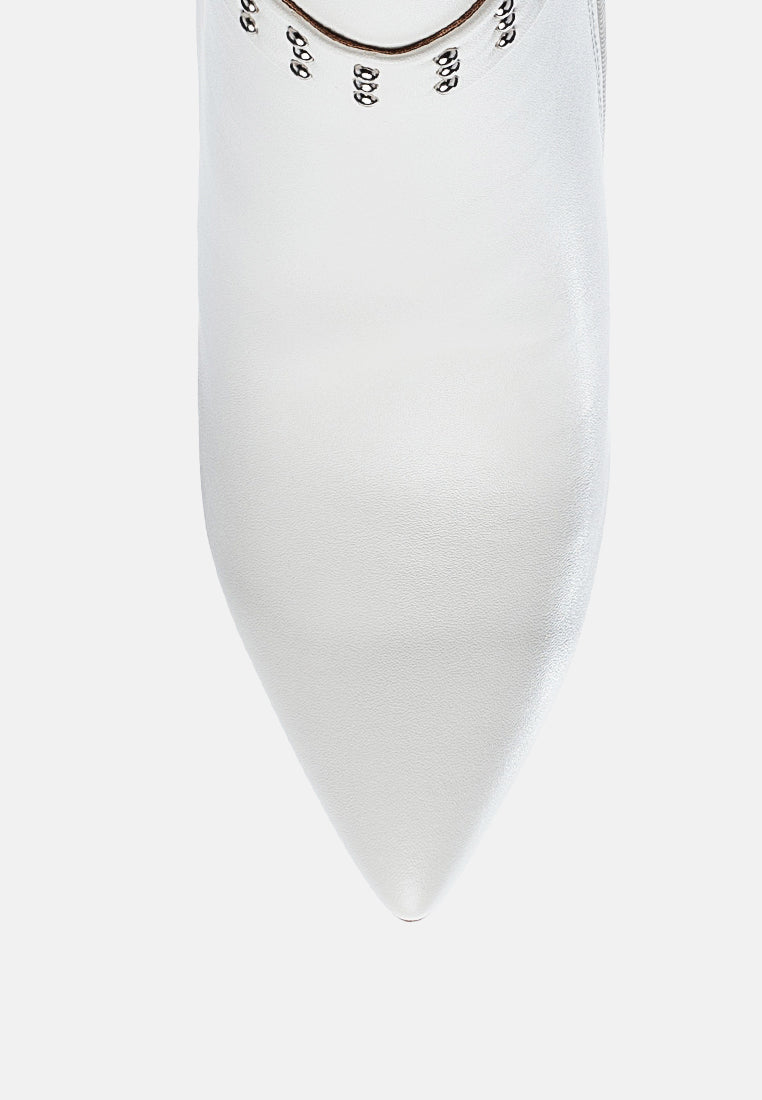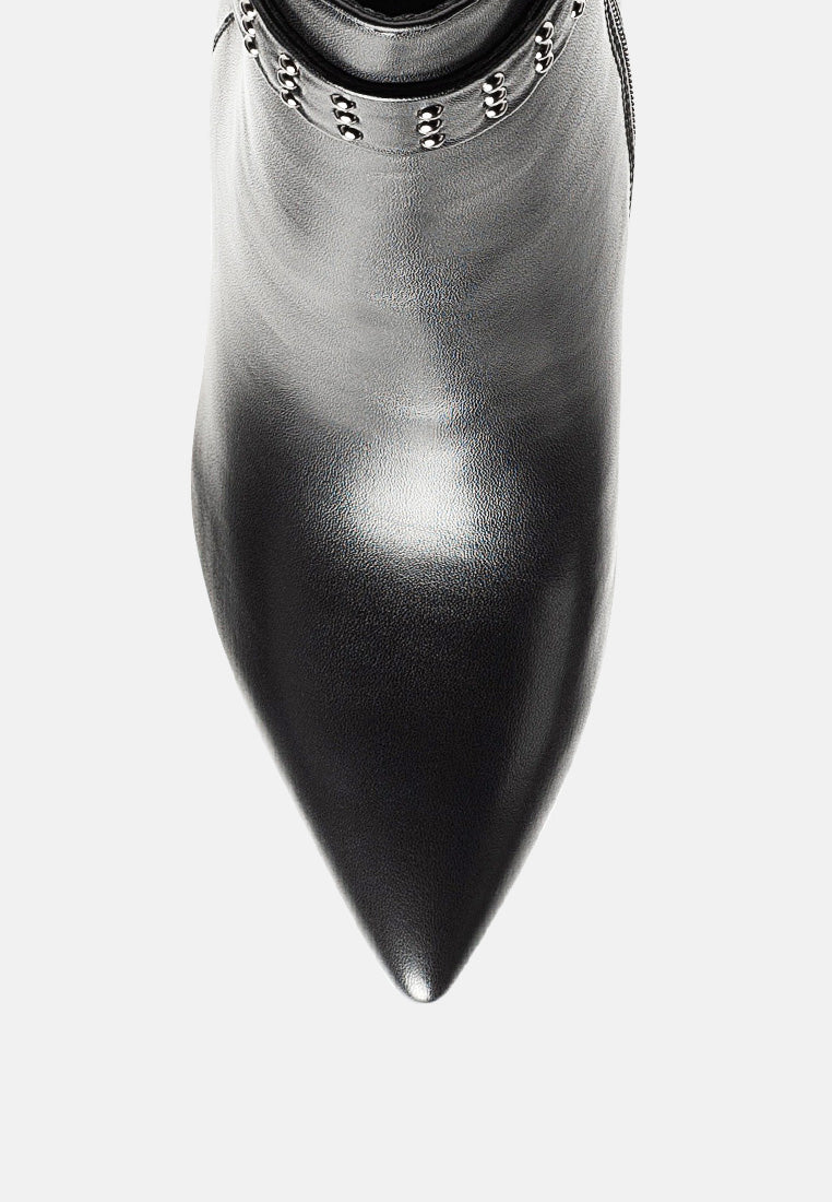 The boots are all jazzed up with with metal studs and chain embellishments which instantly elevate and cut through the monotony on the monochrome boots. The stiletto heel look sharp and sexy. These are the perfect accessory for a weding party as wedding heels, bridal shoes, after party shoes at a winter wedding!