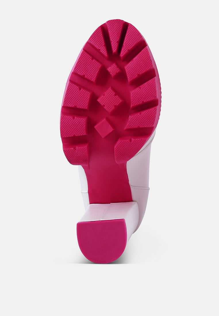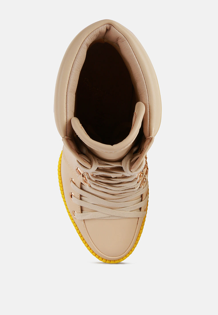 Larch Cushion Collared Biker Boots are Ankle Boots with lace up detail. The colored lug sole platform adds to the look. These high heeled shoes are perfect for any Biker Babe, ready to kill anyone with their unique looks. It is a closed pointed shoe with Mettalic eyelets and a Mettalic buckle at the back. The contrast and uniqueness being its USP, these girls' boots are a must have in your wardrobe.
