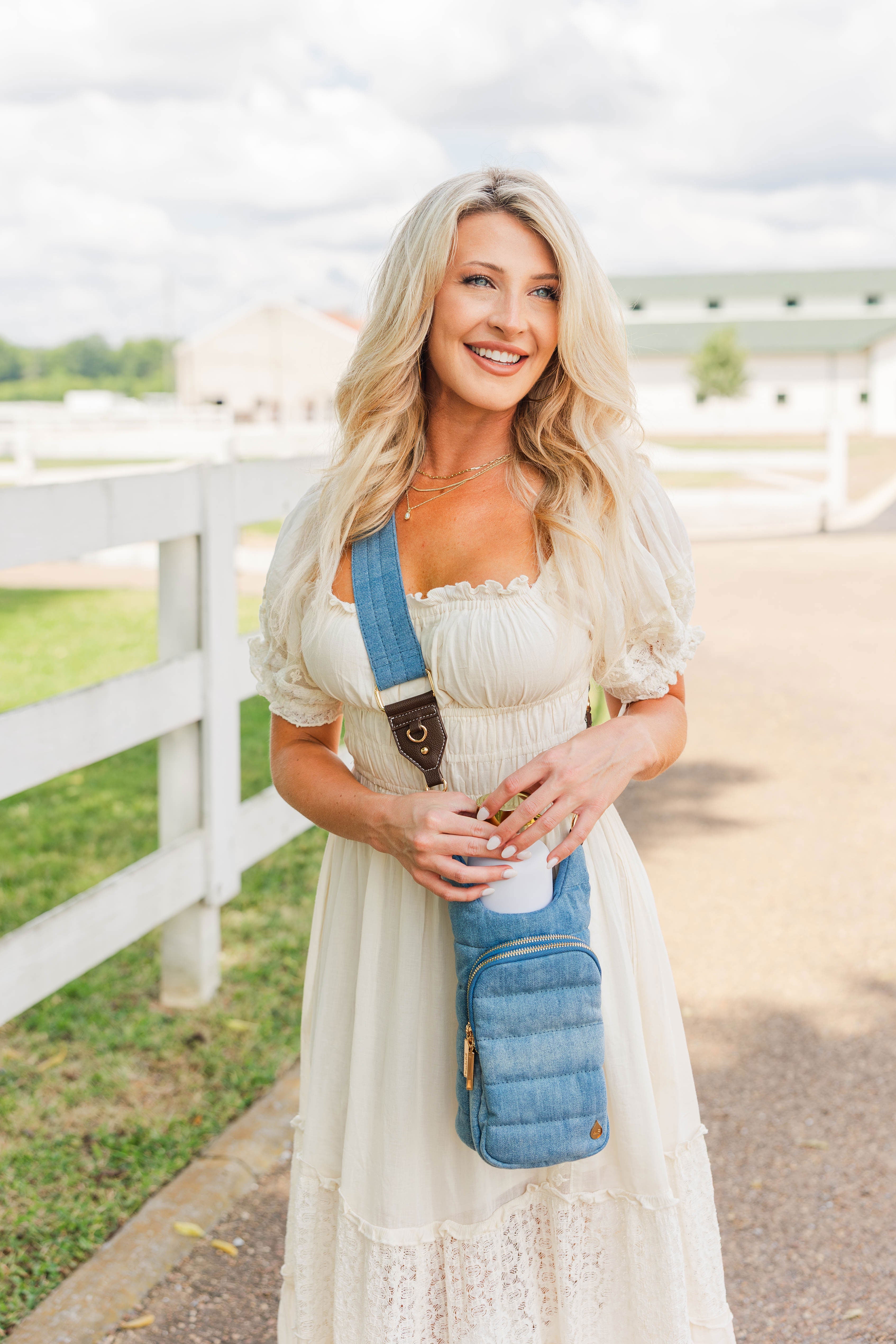 Light Denim HydroBag® with Gold Hardware and Denim overlaid Vegan Leather Strap