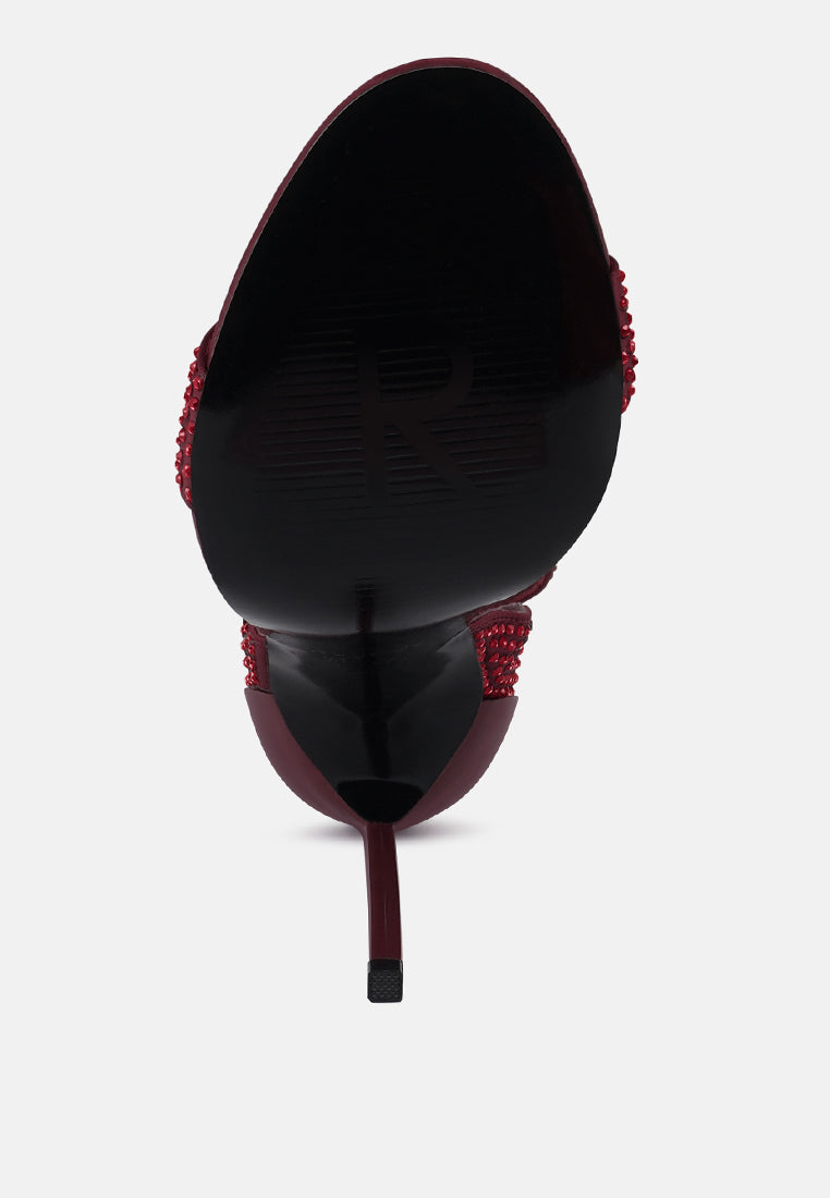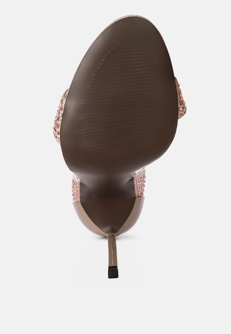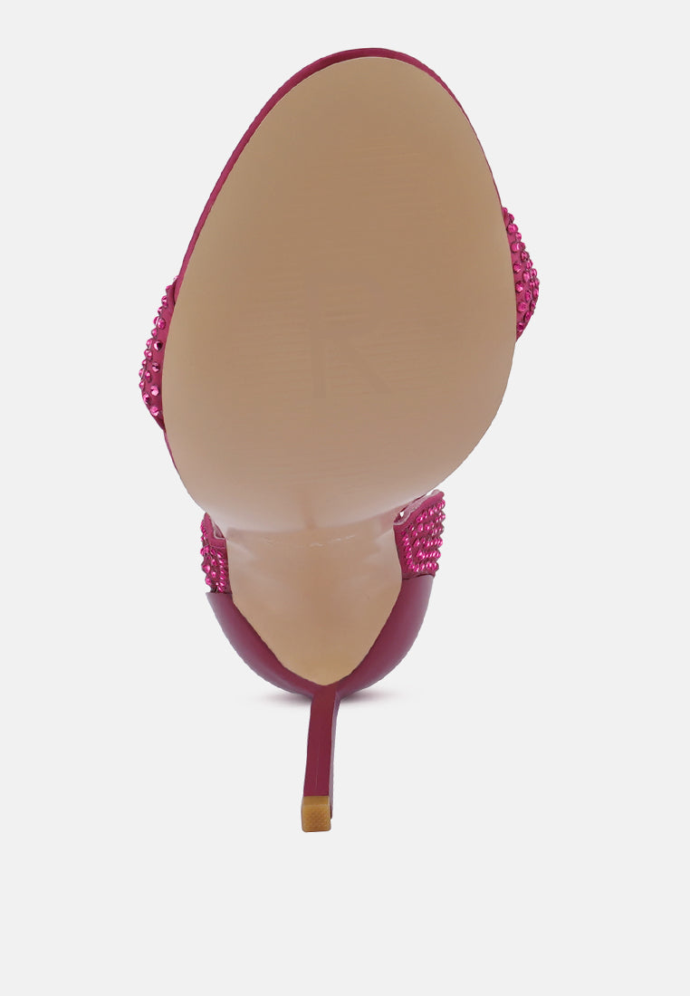 These stiletto sandals are all bling with rhinestone embellishment set all over the exterior including the ankle strap. The open almond toe looks stylish and elegant, yet sexy, with the high pencil heels. The lightly padded sole also cuts strain and offers comfort. The sandals are luxurious and perfect for special and fancy occasions.