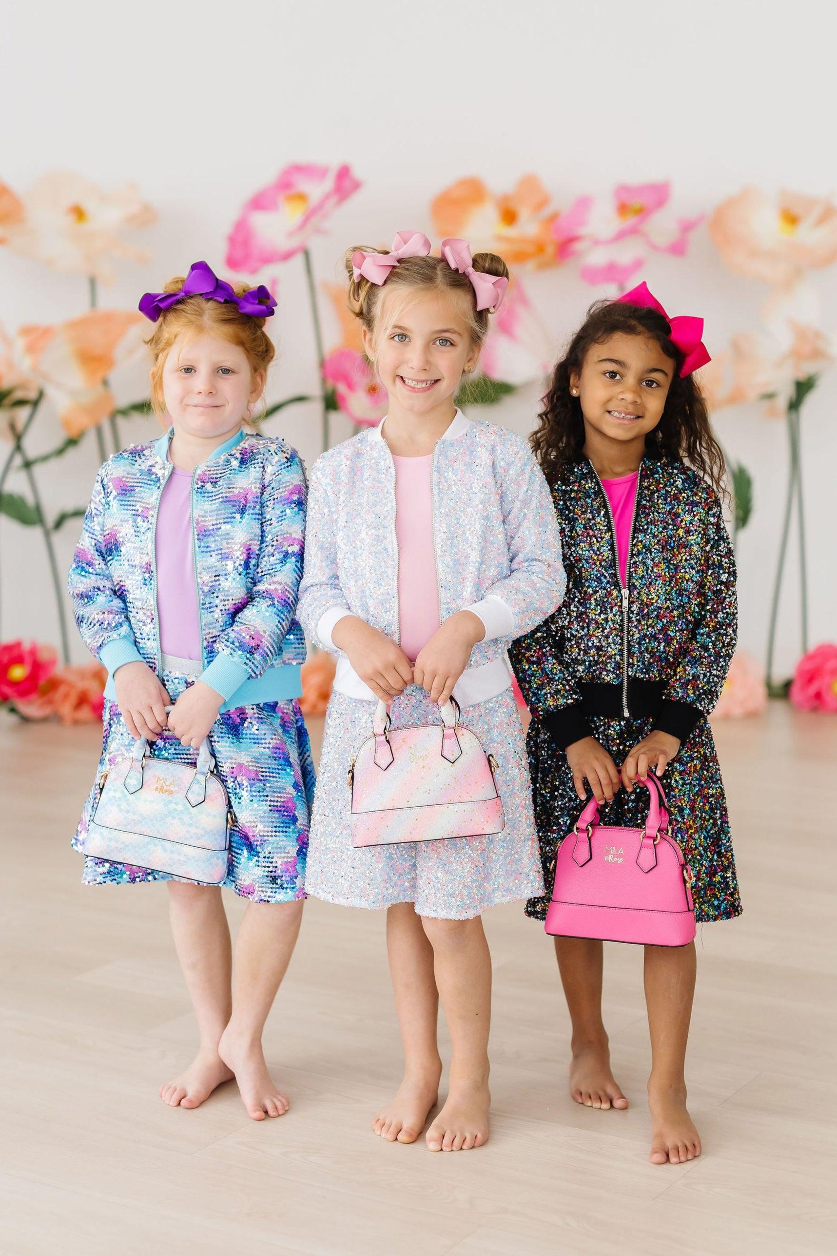 You asked, we listened!  Our sequin twirl skirts are back and better than ever, but this time with attached SHORTS.  Mix and match with our tees and jackets to sparkle up any outfit!  Perfect for birthdays, holidays, and special occasions.  This skort adds the perfect amount or shine to any outfit. Also available in a matching Jacket.