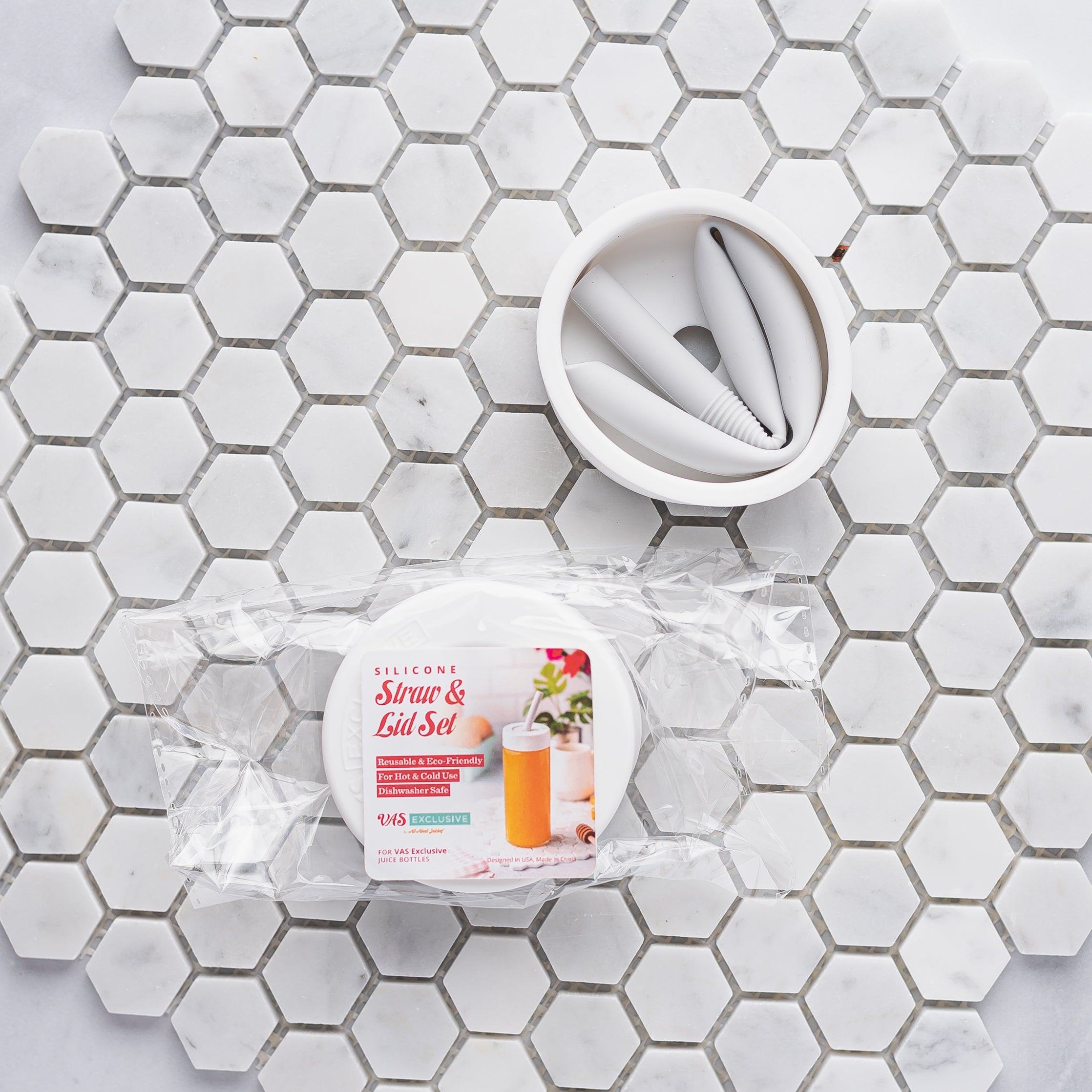 Our Patented straw lid is necessary for the everyday juicer. Instantly turn your juicing bottles into a stylish glass tumbler! Juice prep and store your beverages in VAS Exclusive glass bottles with a regular lid, and when ready to drink, pop this straw lid on for a spill-free drinking experience.