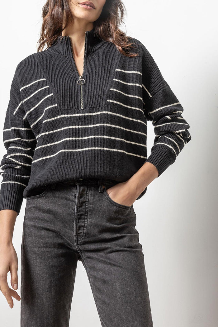 In our mid-weight cotton blend yarn, this striped half-zip sweater is relaxed for an effortless look. The bottom draws in slightly to create a blouson look. Pair this with your favorite denim or sweats for an everyday look that is perfectly on-trend. -60% Cotton/40% Polyester -Length: 23" (size Medium) -Relaxed, easy fit -Functional front zipper -Model is 5'10" and wearing a size Small -Hand Wash