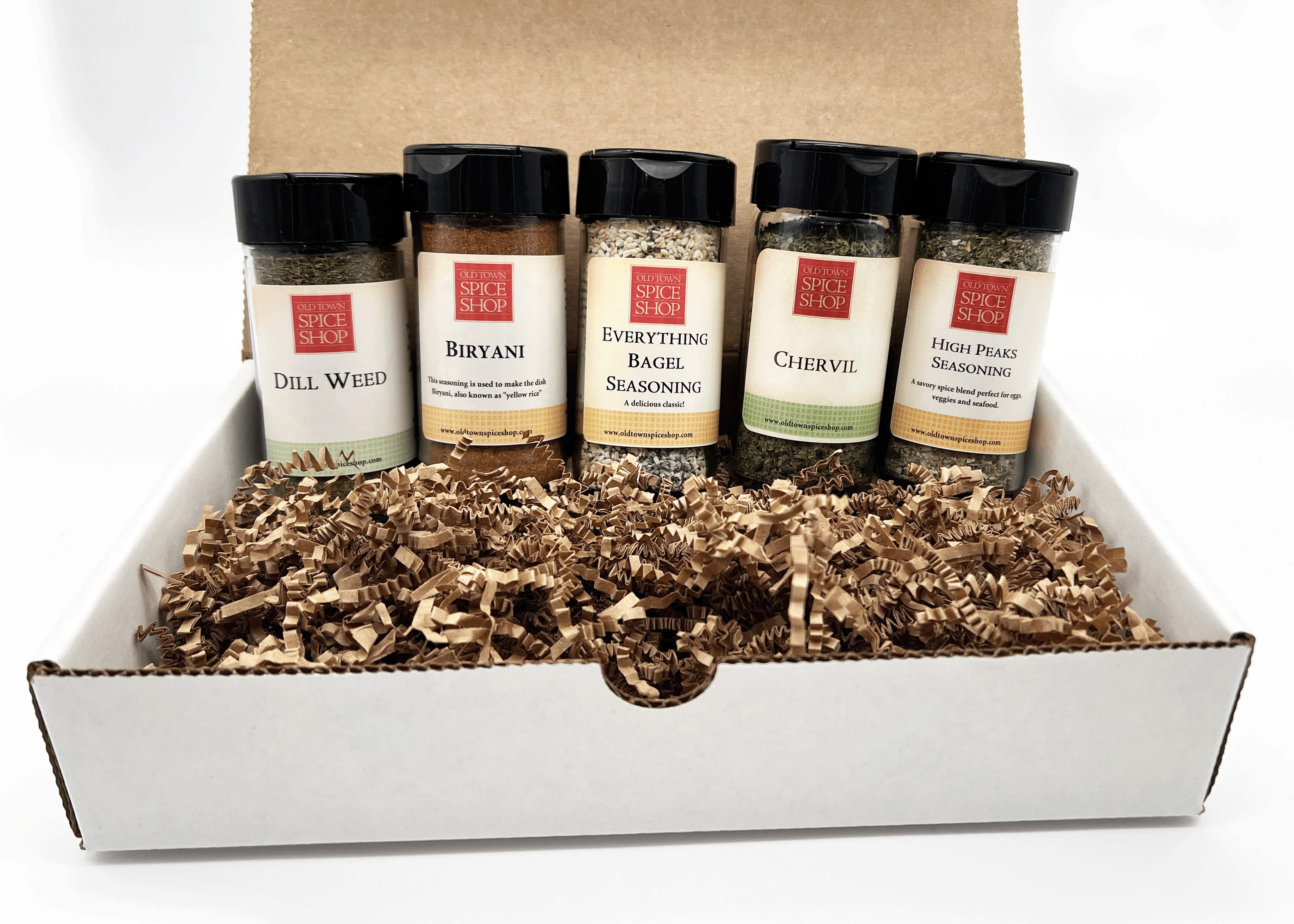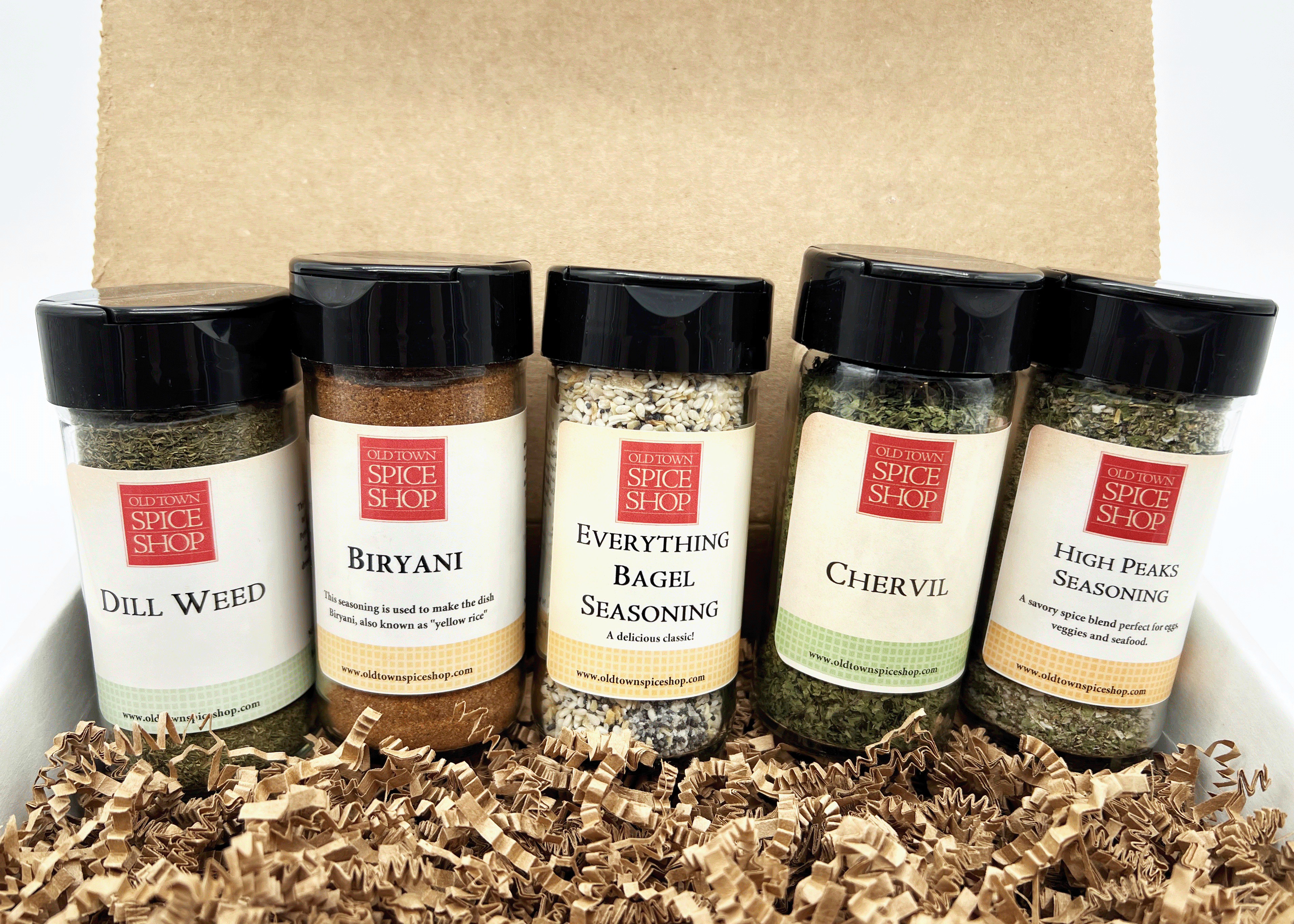 2.1 oz Jar Everything Bagel Seasoning, 2.2 oz Jar High Peaks Seasoning, 0.7 oz Jar Dill Weed, 2 oz Jar Biryani, 0.3 oz Jar Chervil