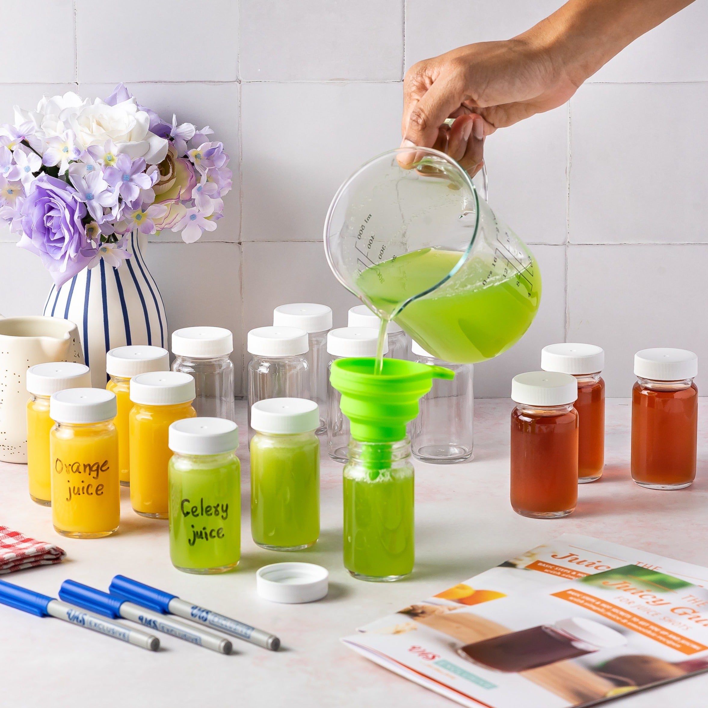 • 16-pack set of glass Juice Shot Bottles, 2oz; white lids with foam liner