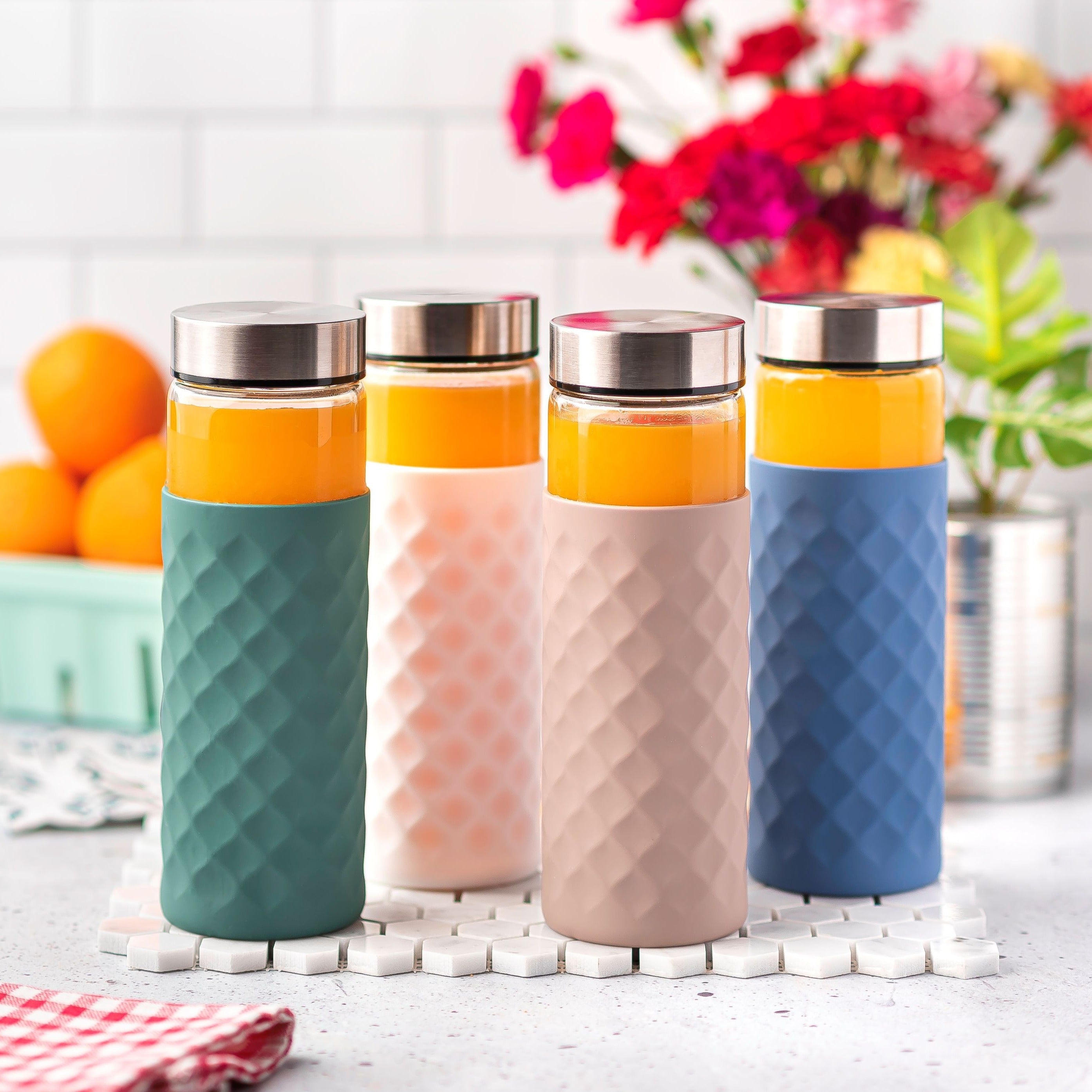 • 4-pack set of Skinny Series Glass Bottles, 10oz; stainless steel lids