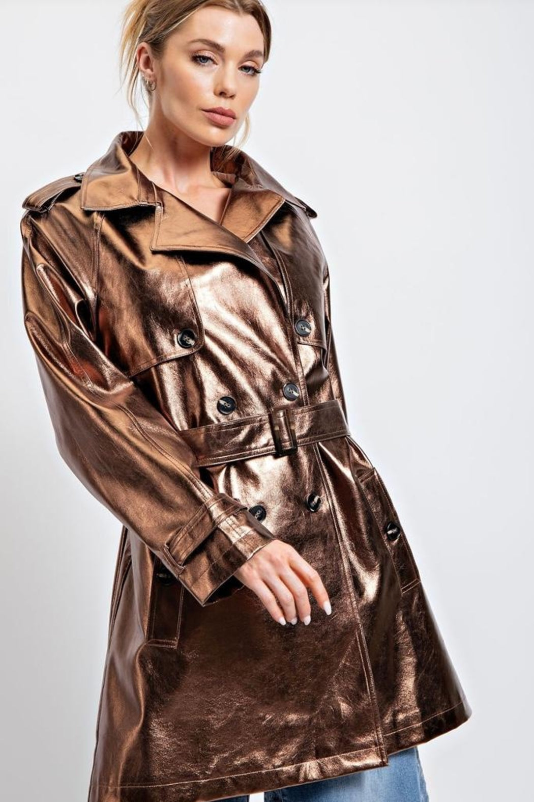 Fashionable trench coat in bronze metallic, crackled finish, double-breasted button closure, notched lapel collar, shoulder button tab accents, long sleeves with belted closure accent, longline relaxed silhouette, side pockets, with matching waist belt with rectangle buckle closure. Polyurethane polyester rayon blend, non-sheer.