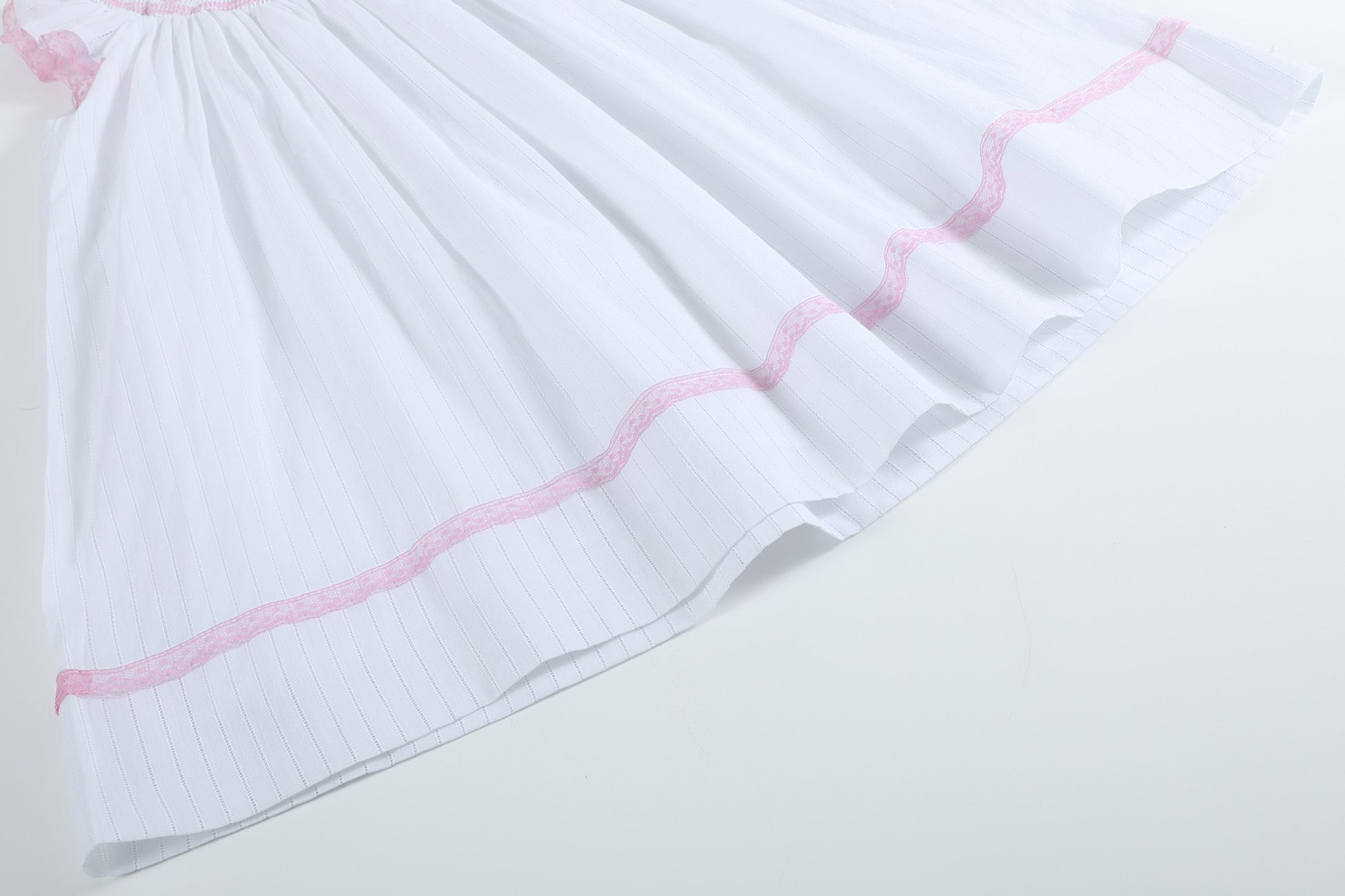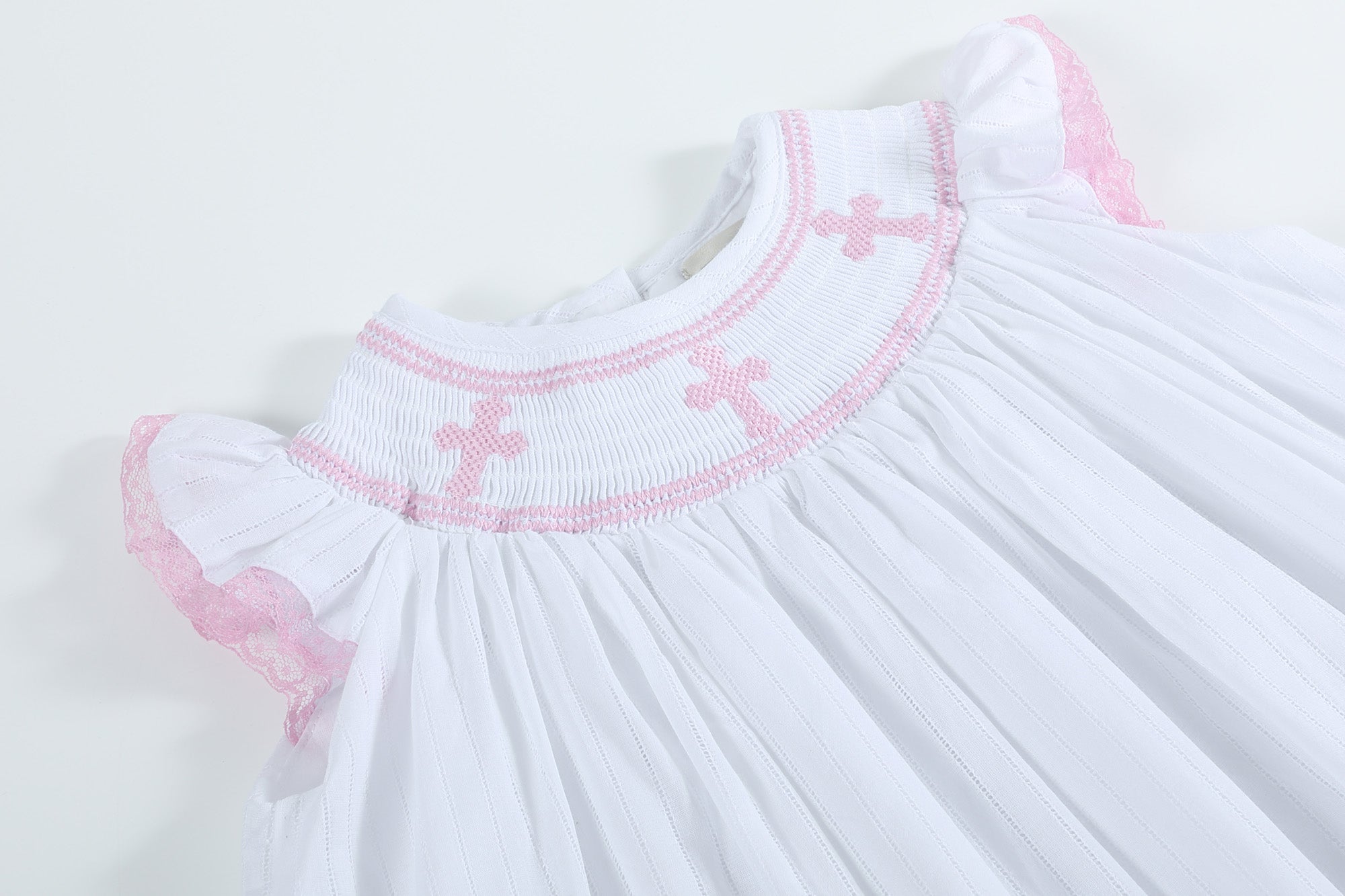 Absolutely Adorable! This charming dress is timelessly pretty. Made in a lightweight cotton fabric that will keep her cool and comfortable as she plays. The classic styling is updated with pops of pink and beautifully embroidered crosses. Perfect for Sunday service with grandma or for a fun day with Grandma.