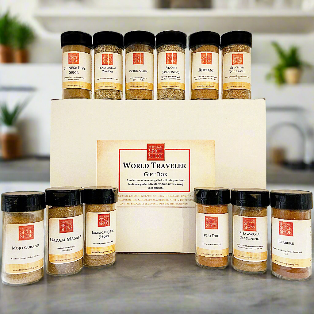 2.4 oz Jar Mojo Cubano, 1.7 oz Chinese Five Spice, 2.2 oz Jar Shichimi Togarashi, 1.9 oz Jar Carne Asada, 2.5 oz Jar Hot Jamaican Jerk, 2 oz Jar Garam Masala, 2 oz Jar Berbere, 2.8 oz Jar Adobo, 1.4 oz Jar Traditional Za'atar, 2 oz Jar Shawarma Seasoning, 2.7 oz Jar Piri Piri Blend, 2 oz Jar Biryani