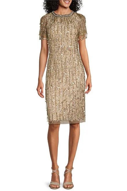 Aidan Mattox Light Gold Beaded Sequin Crew Neck Short Sleeve Dress