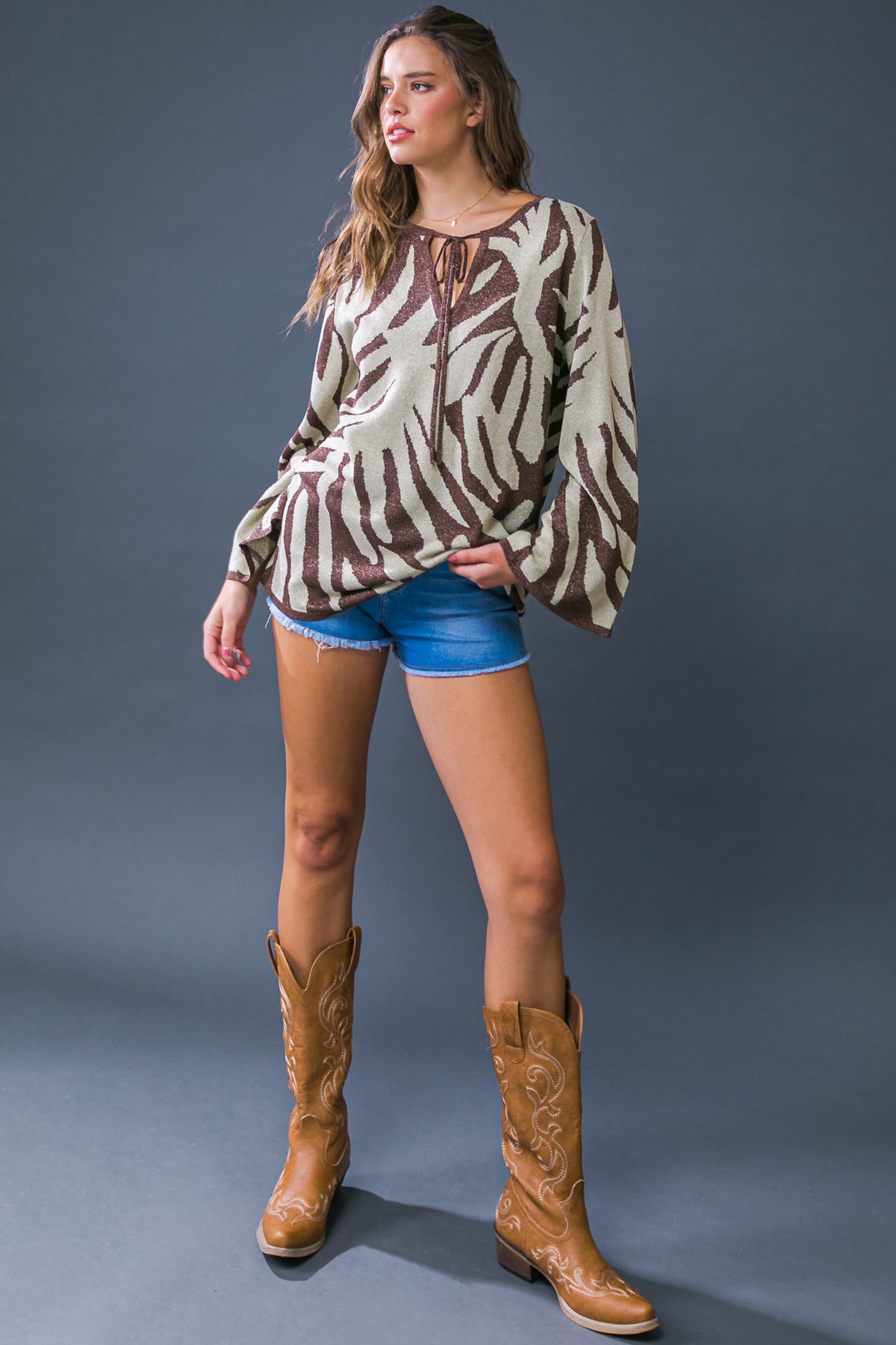 This ALL MY HEART SWEATER TOP is knitted from a metallic yarn that adds a touch of shimmer to the cozy design. Its round neckline is complemented by a front tie and long bell sleeves for a fashionable look. It's the perfect choice for adding a subtle sparkle to your casual wardrobe.