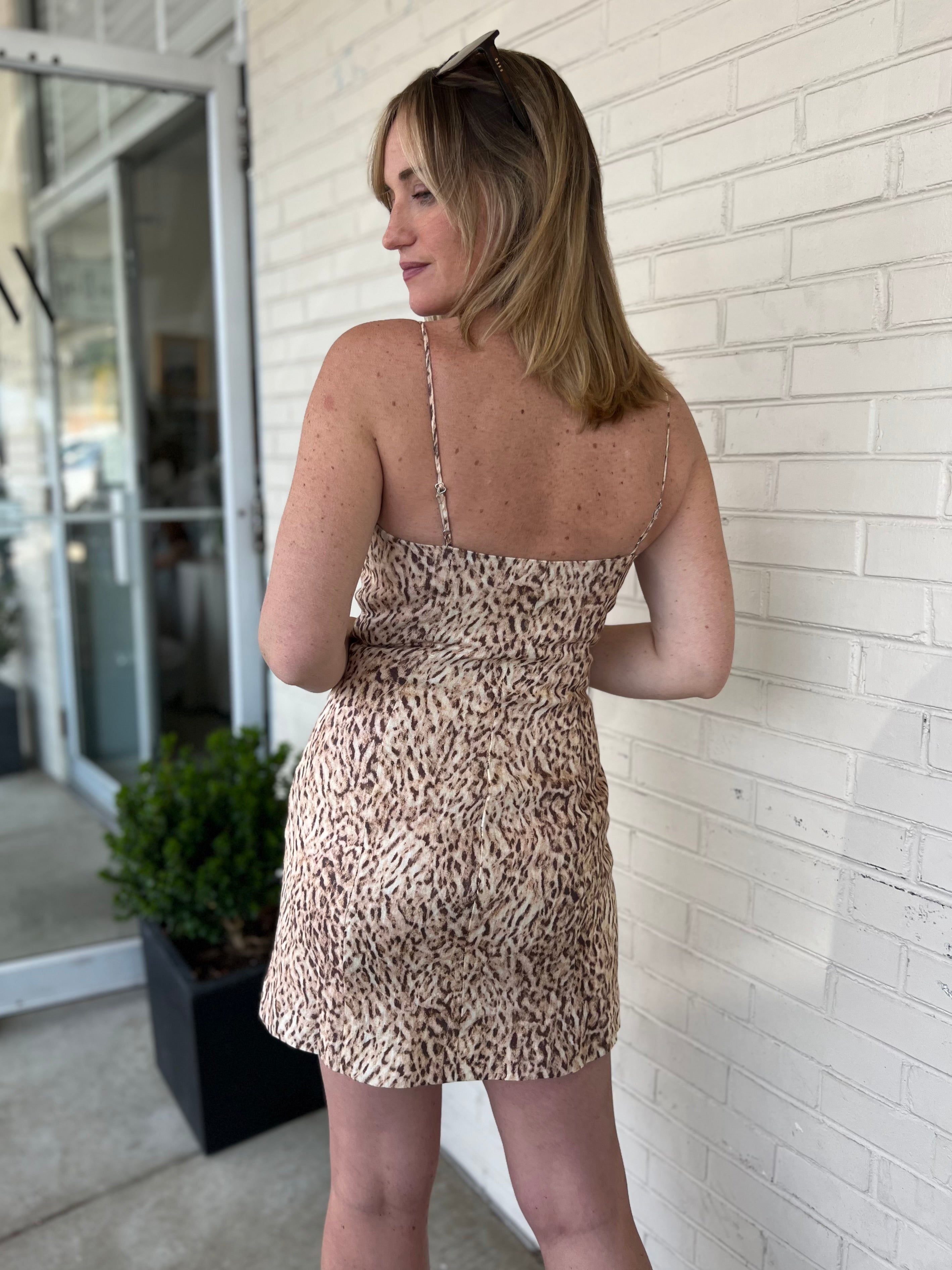 Introducing the perfect dress for a wild night out - the ASTR The Label Frankie Mini Dress! With sleeveless design, square neckline, and a sassy side slit, you'll turn heads all night long. Plus, adjustable straps and back zipper make it a comfortable fit for every body type. Let the leopard print unleash your inner feisty fashionista.