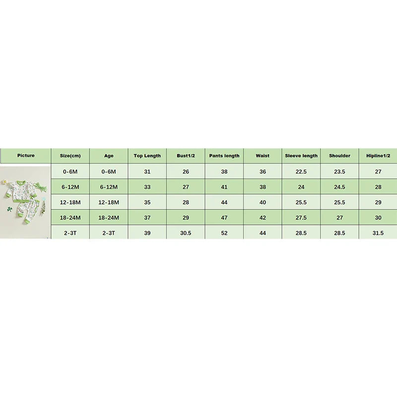 90 Tops Length: 13.78 Bust: 22.05 Sleeve: 10.04 Shoulder: 10.04 Pants Length: 17.32 Waist: 15.75 Hip: 22.83 Advised Age: 9-12 Months