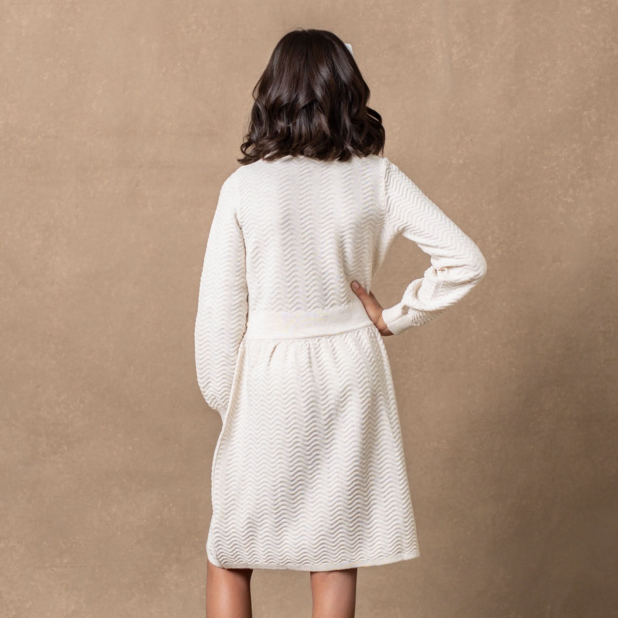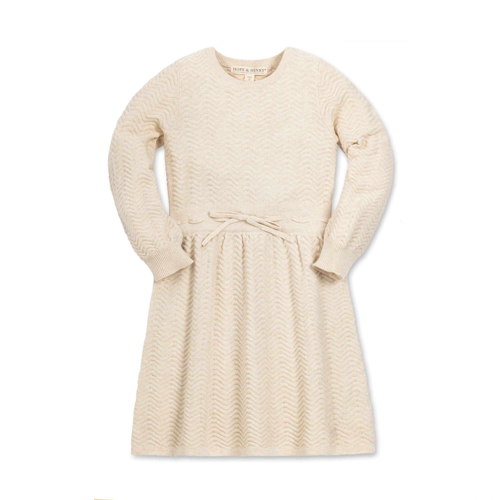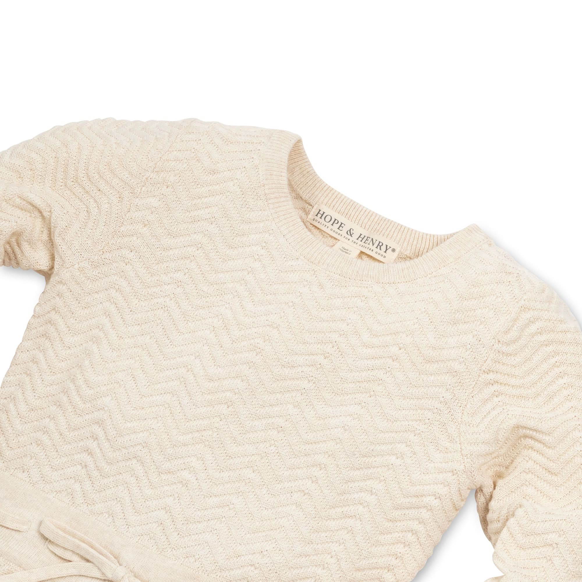 She'll be the epitome of chic in our adorable pull on sweater dress in soft organic cotton. Features fun and flattering bubble sleeves, a gorgeous chunky chevron stitch texture, gathering at the waist, and a rib knit waistband with decorative bow tie. The perfect combination of style and comfort in one super cozy dress.
