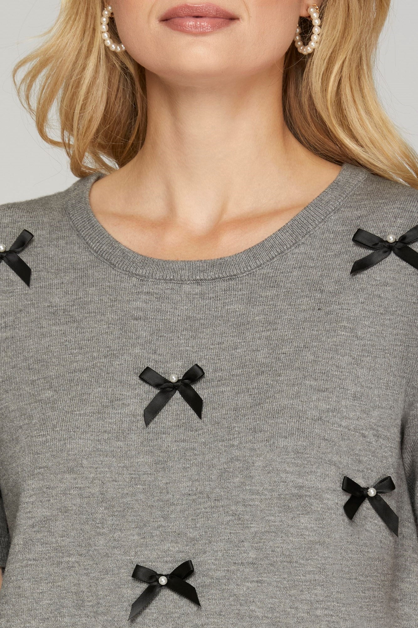 The soft knit material provides just the right amount of warmth for those crisp autumn days, while its short sleeves offer versatility perfect for layering or wearing on its own. But let's talk about those satin bowsâeach one meticulously placed to add a touch of whimsy and sophistication. Whether you're headed to a casual brunch or an evening out, this sweater transitions seamlessly from day to night.