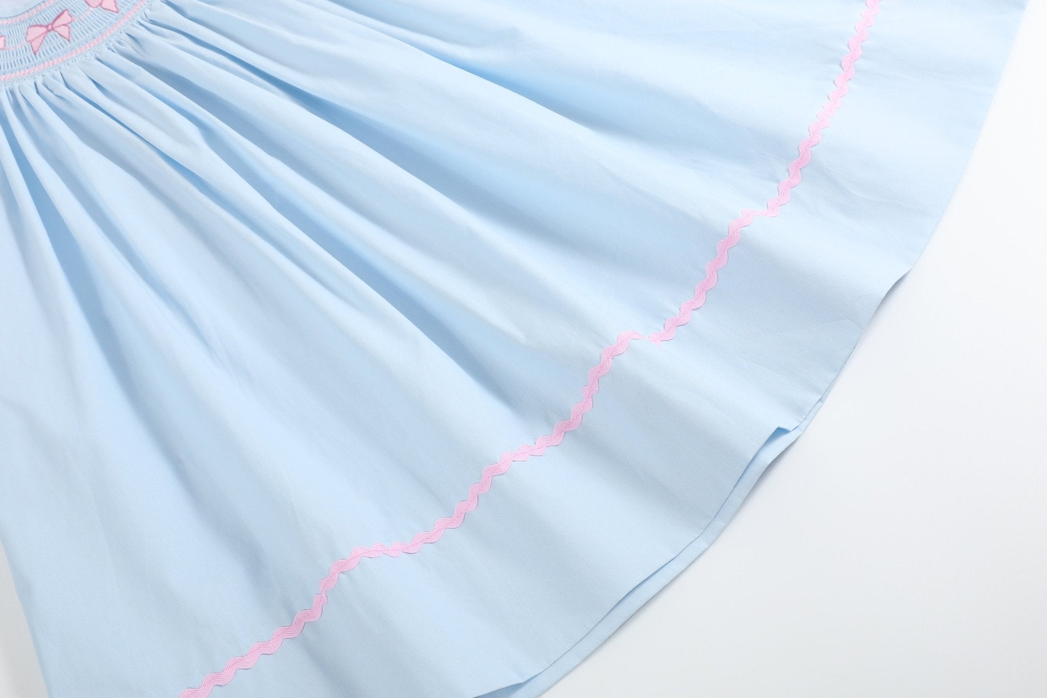 This Blue and Pink Bow Smocked Bishop Dress is a timeless choice for your little girl. The smocked neckline is adorned with delicate embroidered pink bows, complemented by pretty pink rickrack trim details. Designed in the classic bishop length, it gracefully falls to mid-calf/ankles, offering an elegant silhouette. Perfect for special occasions or everyday wear, this dress exudes sweetness and charm.