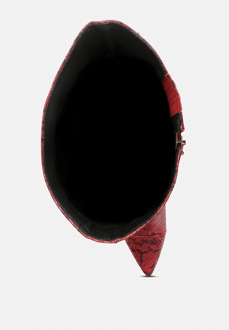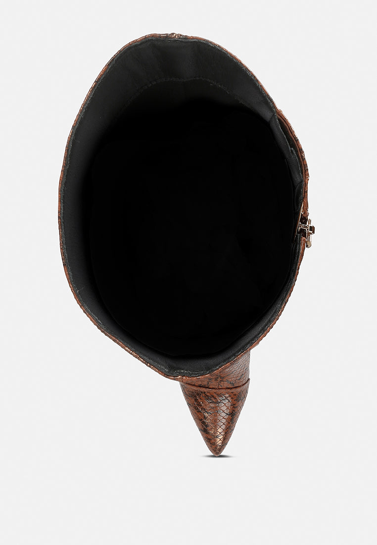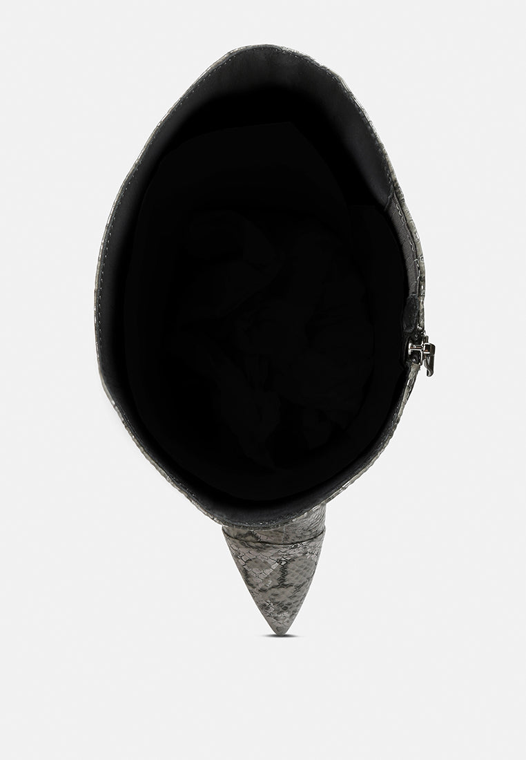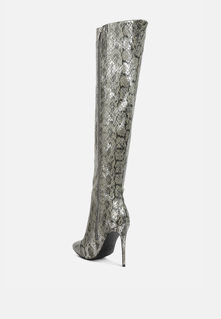 Wearing these amazing snake pattern knee heel boots will make you stand out from the crowd. The all-over pattern is eye-catching and unique, the heels will enhance your confidence, and the side zipper opening makes it simple to put on. These boots are essential for dressing up for a night out or adding some flair to your everyday outfit.