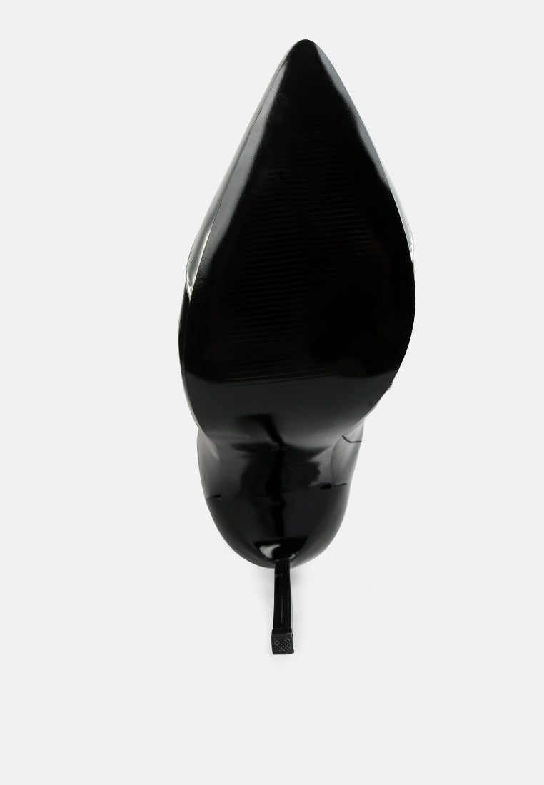 Elegant and Sharp: Pointed Toe high heeled long boots in patent pu shines you through the dull winters, keeping you warm and stylish at the same time. It has mono tone detail of patch on pointed toe tip. The side zipper opening makes it easy to wear and the elasticated gussets make it fit well.