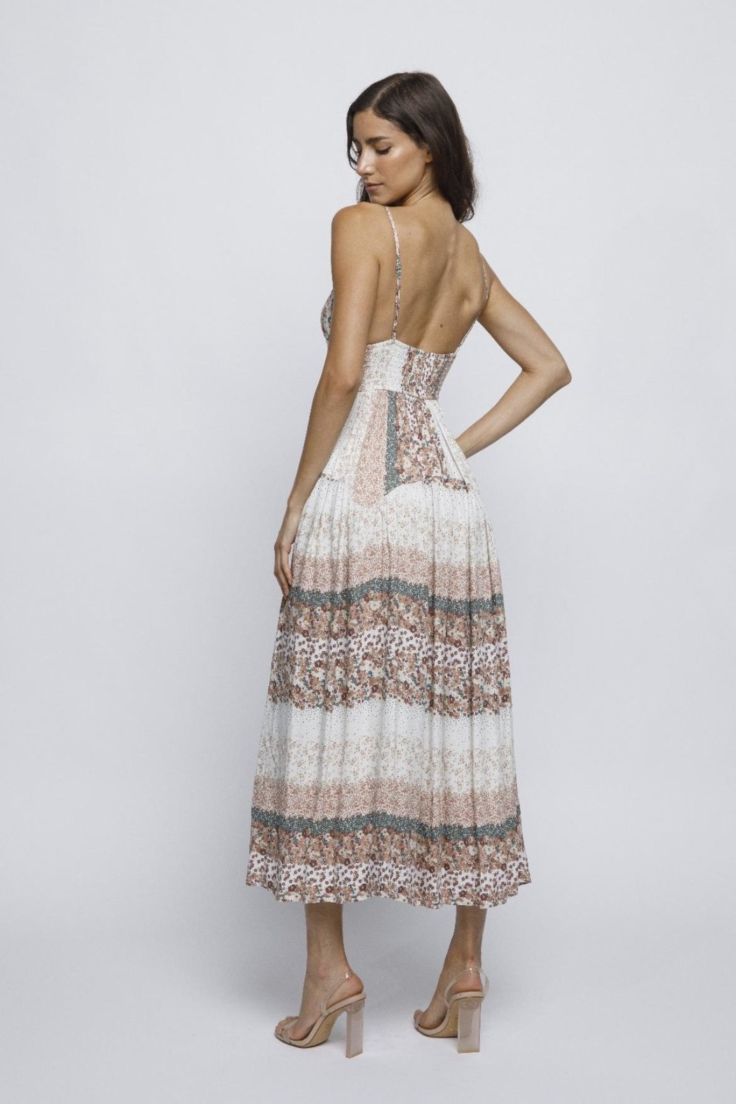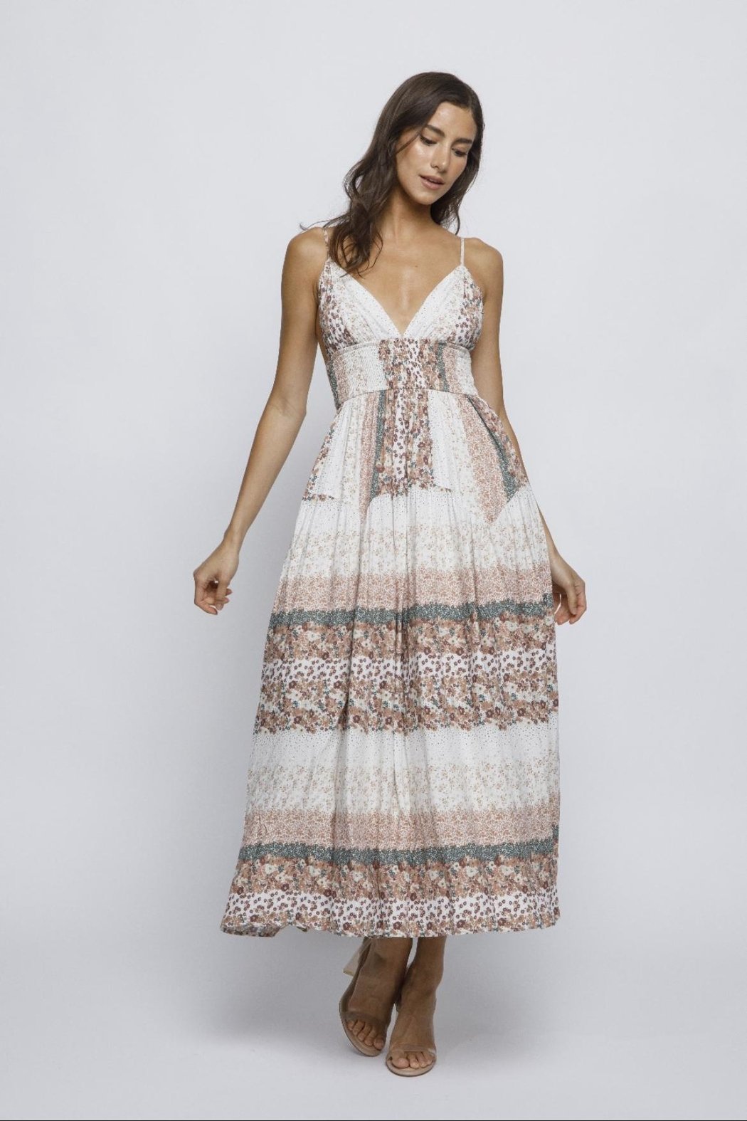 Multi fabric printed color block midi dress with a plunging V neckline gathering under the bust, and adjustable spaghetti straps. It also features a low mid back smocked empire waist. Model is wearing a size Small