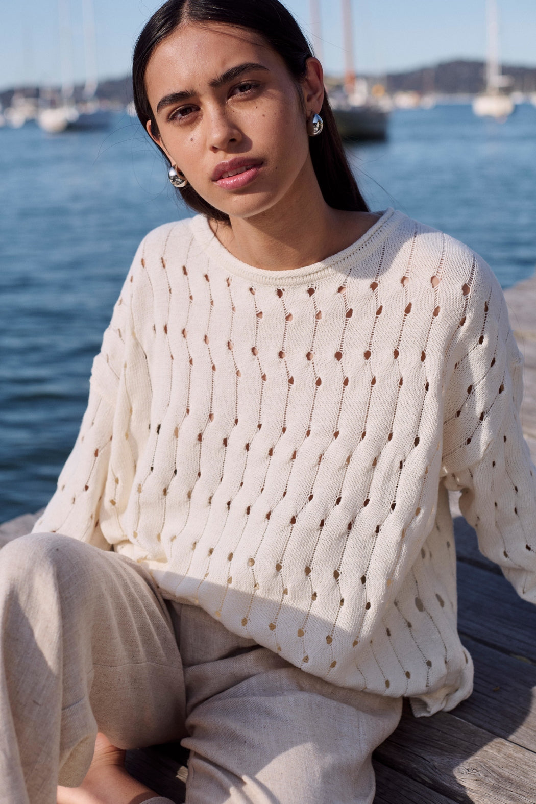 Little Lies - a relaxed and contemporary look. This cream sweater features a round neck, drop shoulder long sleeves, a straight relaxed fit and rolled hems. Made from a soft cotton blend yarn in cream with an open weave pattern. A lovely piece for spring!
