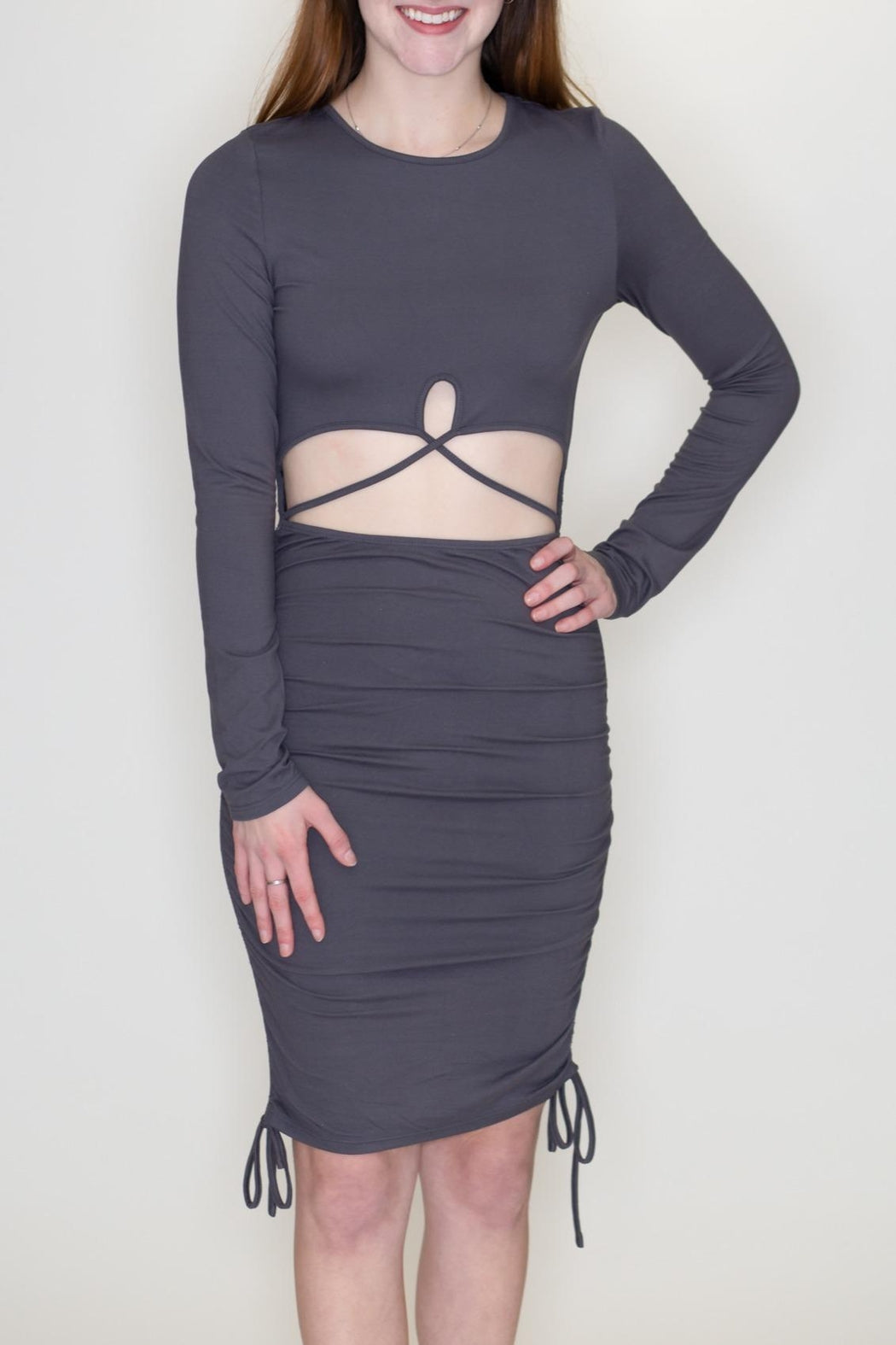 Long sleeve cut out dress with crisscross front and shirring strap detail. Bottom length is adjustable.