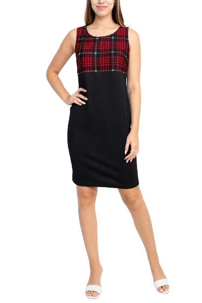 The sleeveless dress features a flattering scoop neckline and a stylish zipper back closure, providing both comfort and ease of wear. Its multi-print design adds a touch of flair and versatility, making it suitable for daytime receptions or transitioning seamlessly into evening affairs.