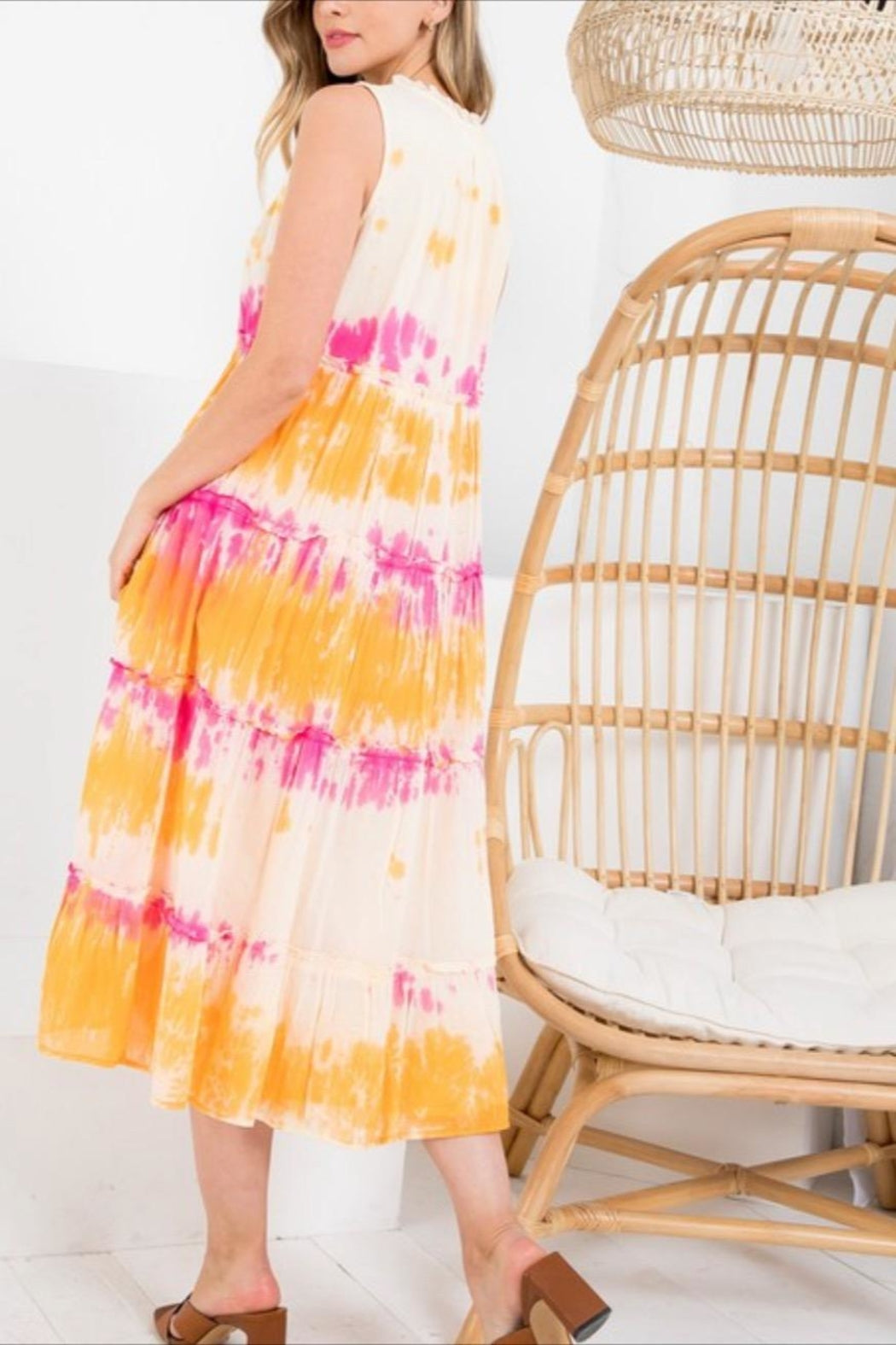 This light weight pink and orange dip dye midi dress is perfect for summer. Lined. Tassels on front. Model is wearing a size small.