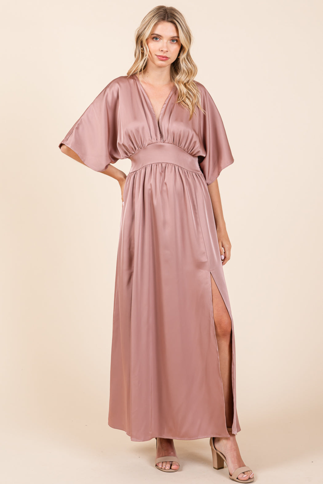 Features: Short Sleeve, V neck, Smocked Waist, Split Hem, Maxi Length, Double Satin Fabric Model is 5'7"(34C 24 34) wearing small- Front Length 52 1/2 Bust 38 kimono, kimono dress, kimono robe silk, wedding wear for women, cocktail dress, formal wear for women, short sleeve kimono, maxi dress
