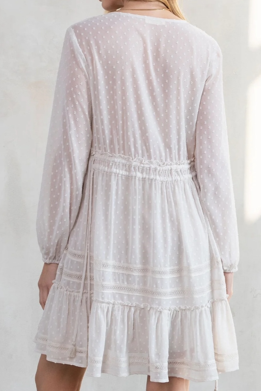 A bohemian tiered mini dress with swiss dot detail throughout. Features long sleeves with an elastic cuff, a split button front neckline, a ruffled waistband with adjustable tassel drawcord, and lace trim detail along the hem. Lining attached. Fabric: 100% Polyester