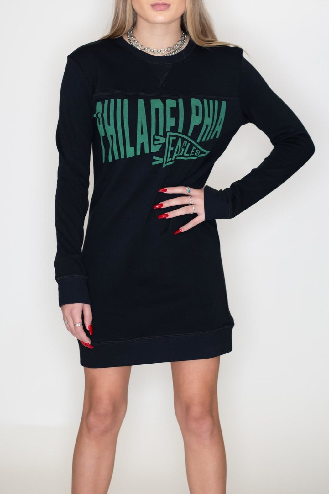 Philadelphia Eagles long sleeve fleece sweatshirt dress. Philadelphia Eagles banner print on front and logo on back.