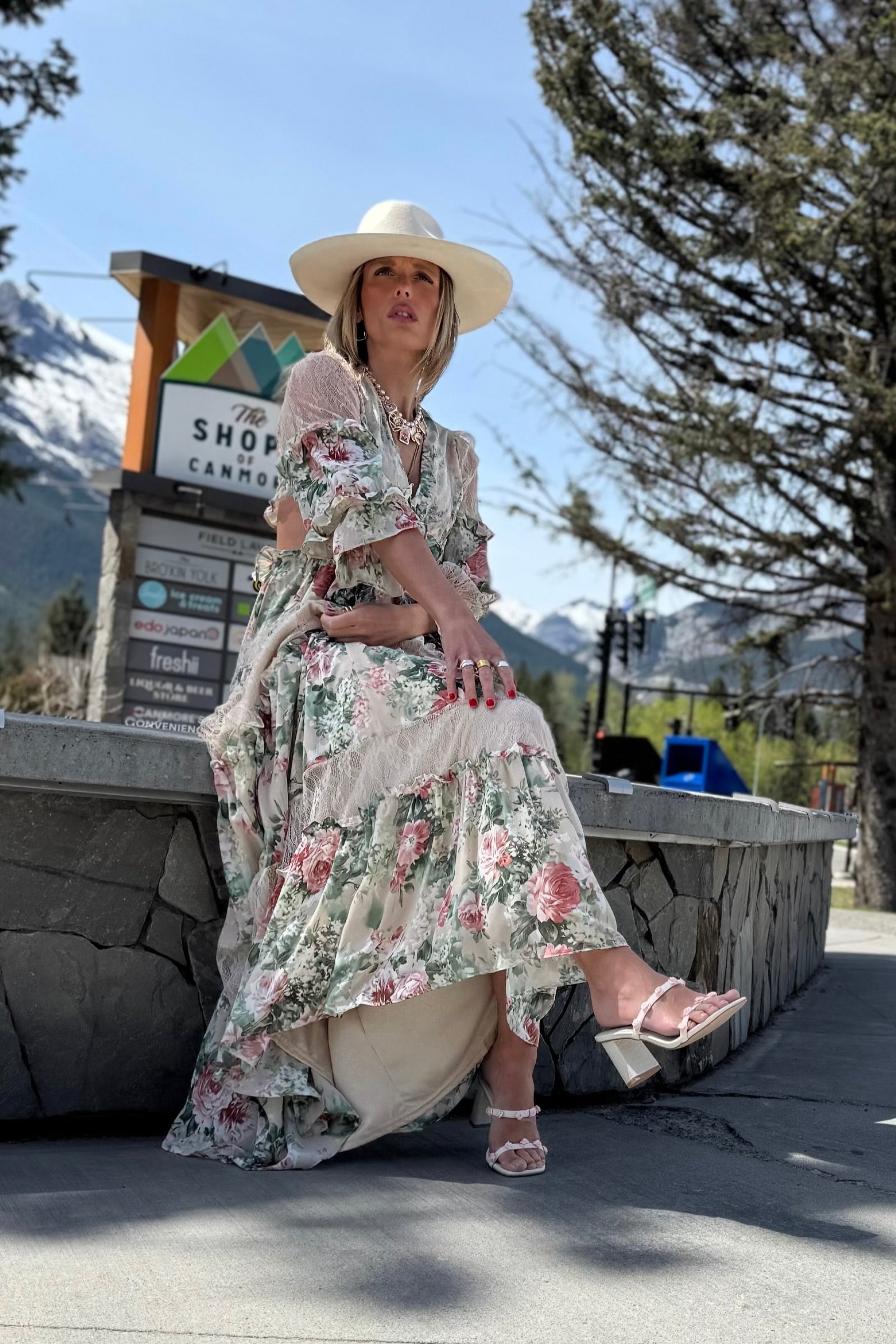 For an effortlessly boho-luxe vibe, pair with statement boho jewelry and strappy sandals. For a versatile day-to-night look, layer with a long black cardigan. And to elevate the look, add a statement belt to accentuate the waistline. This dress features a floral pattern, cut out details, flowy maxi length, ruffle detail along the skirt, semi-sheer bottom layer, lace detail, front button, open back, v-neck, and is not see-through. It also has a tier
