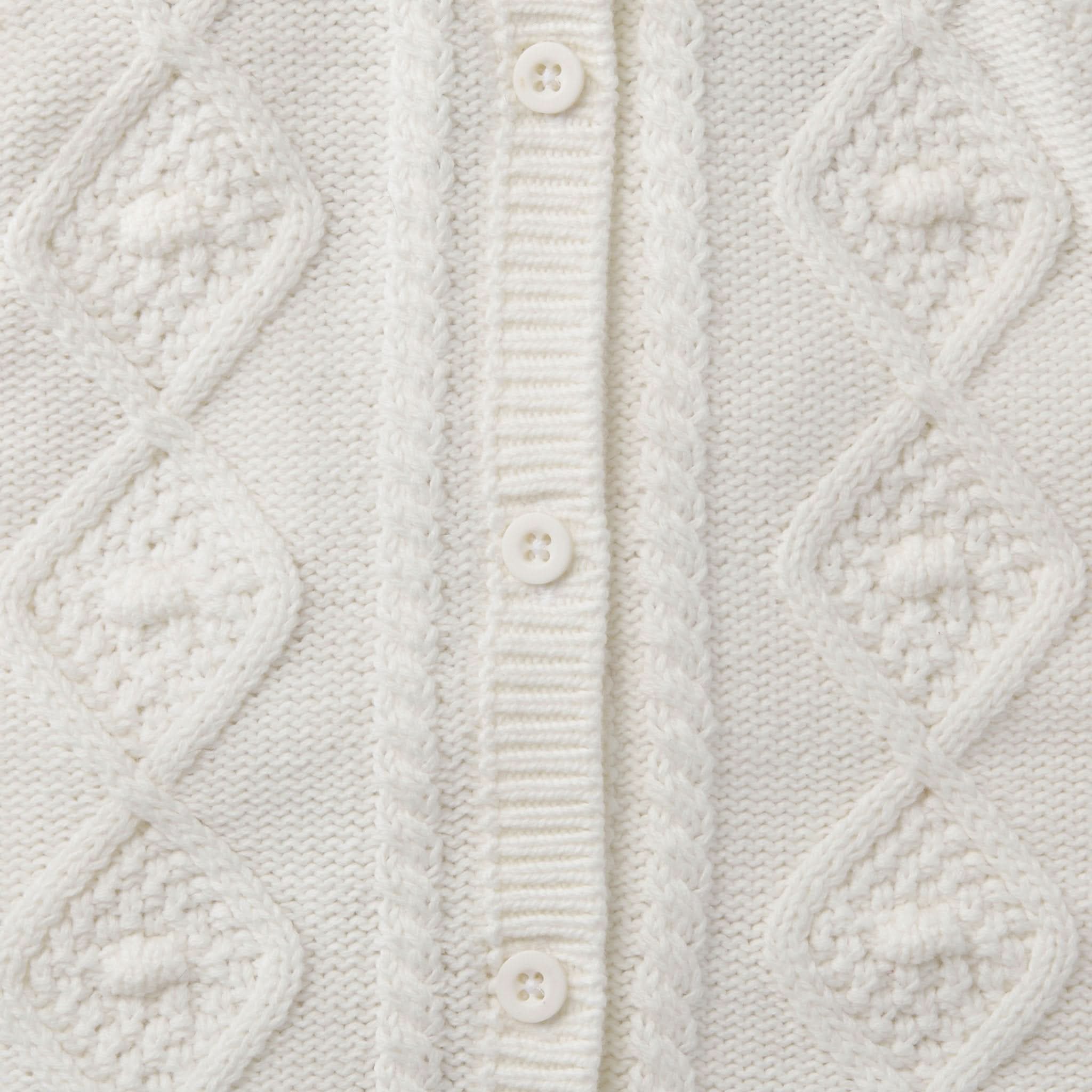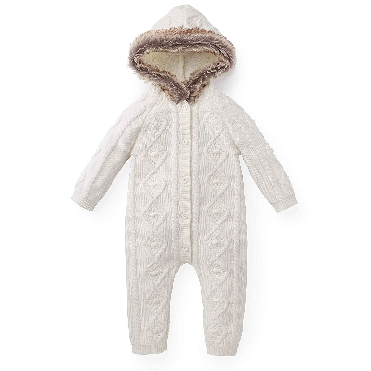 Get your little one cozy and winter ready in our super soft 100% organic cotton hooded cable knit romper. A beautiful cable pattern adorns the front and back, and center front button closure ensures easy dressing. A faux fur trimmed hood adds the final touch!