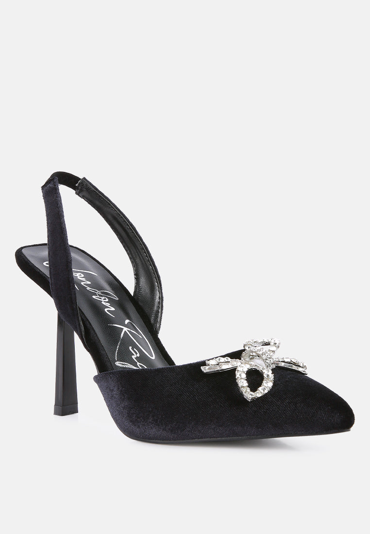 Crafted with supreme construction, this pair of delicate velvet stiletto heeled mules is a true standout. They feature a decorative diamante bow brooch on top, adding drama to the shoe. These closed pointed-toe slingback sandals are trendy and comfortable, thanks to the light cushion insole.