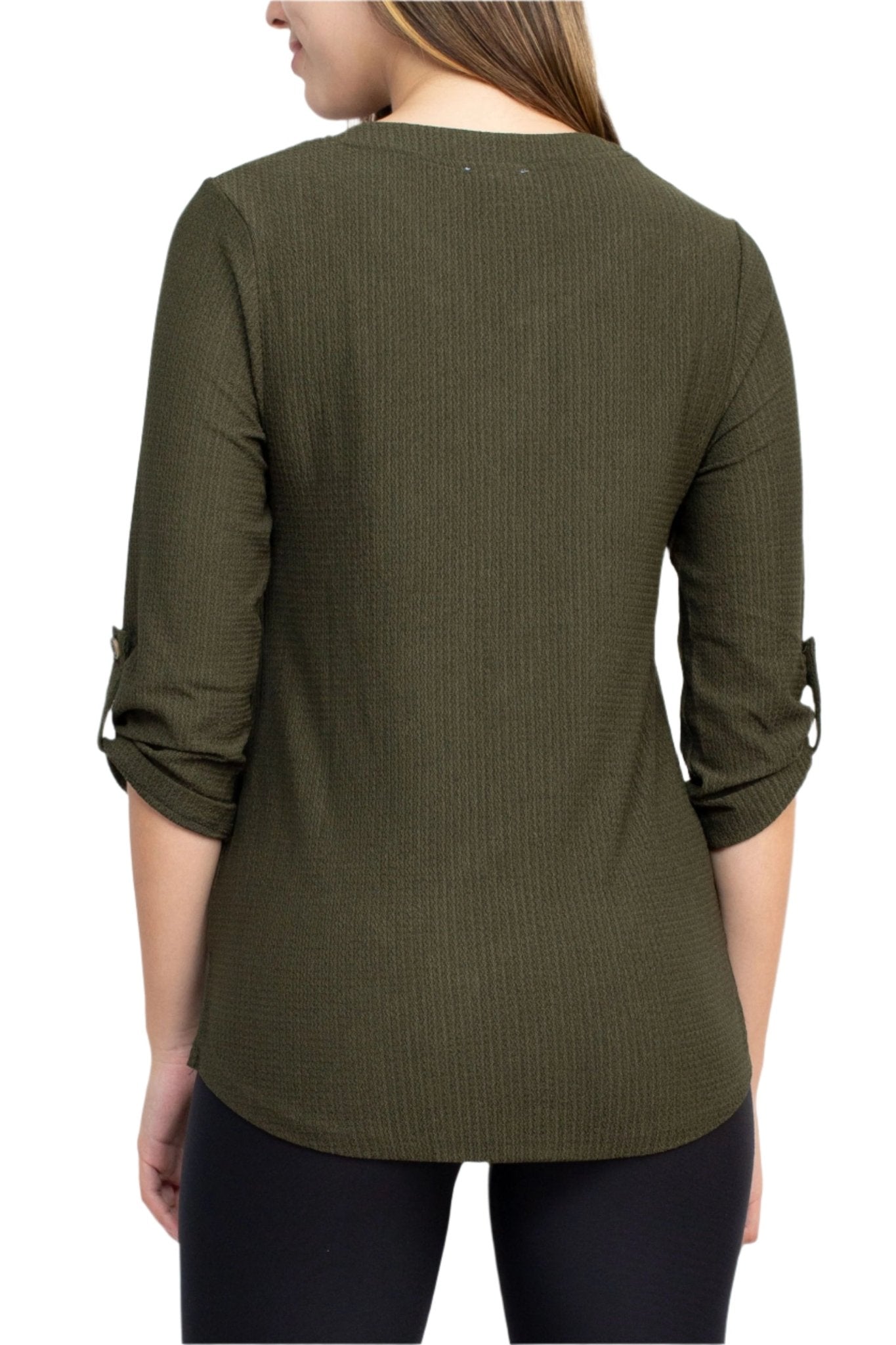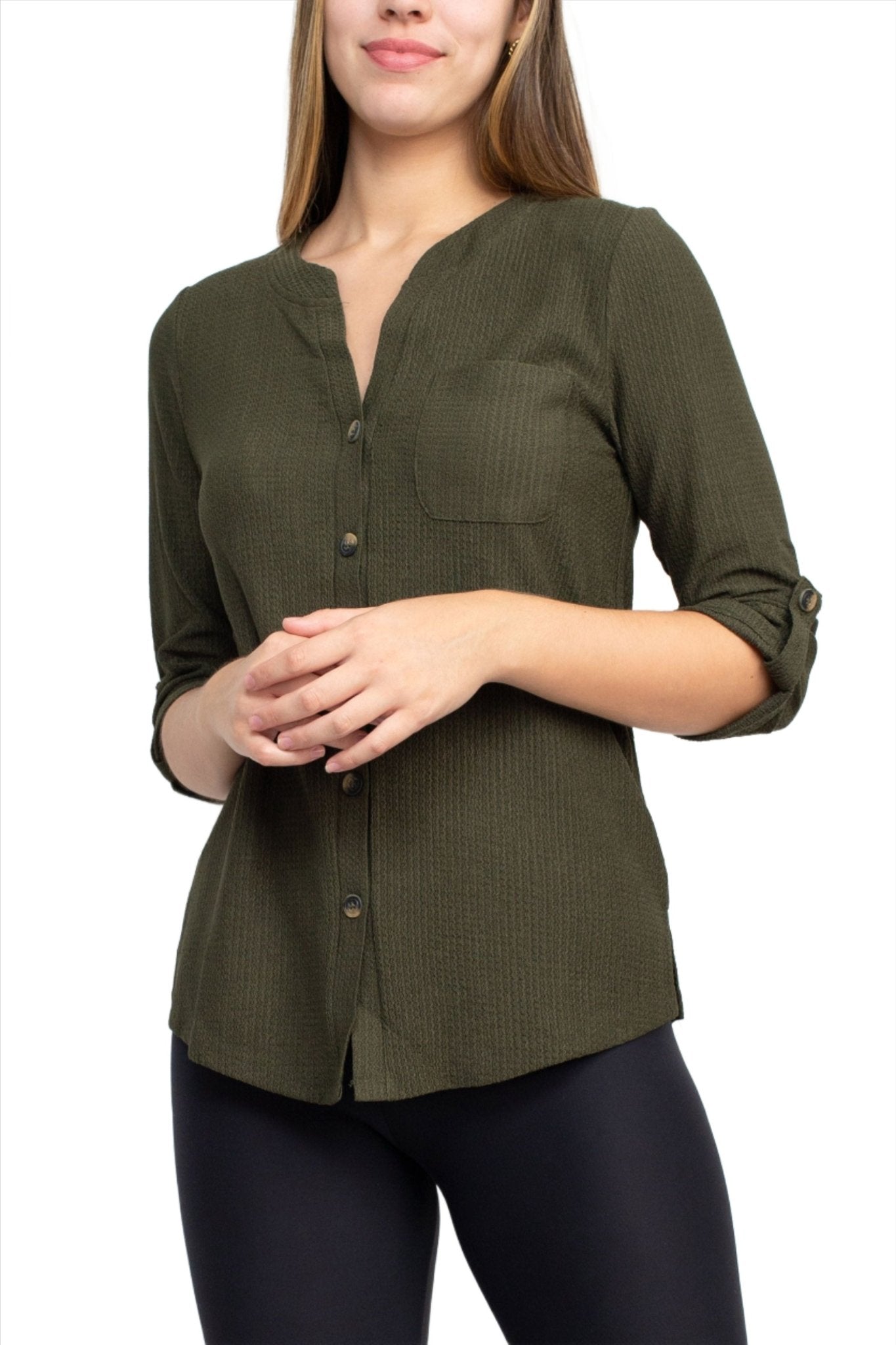 Floral + Ivy Notched Button Down 3/4 Sleeve Solid Knit Top with Front Pocket