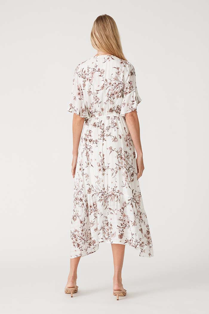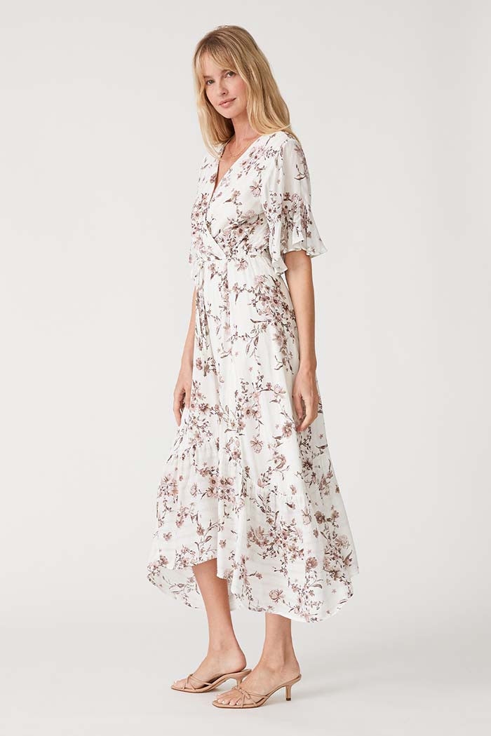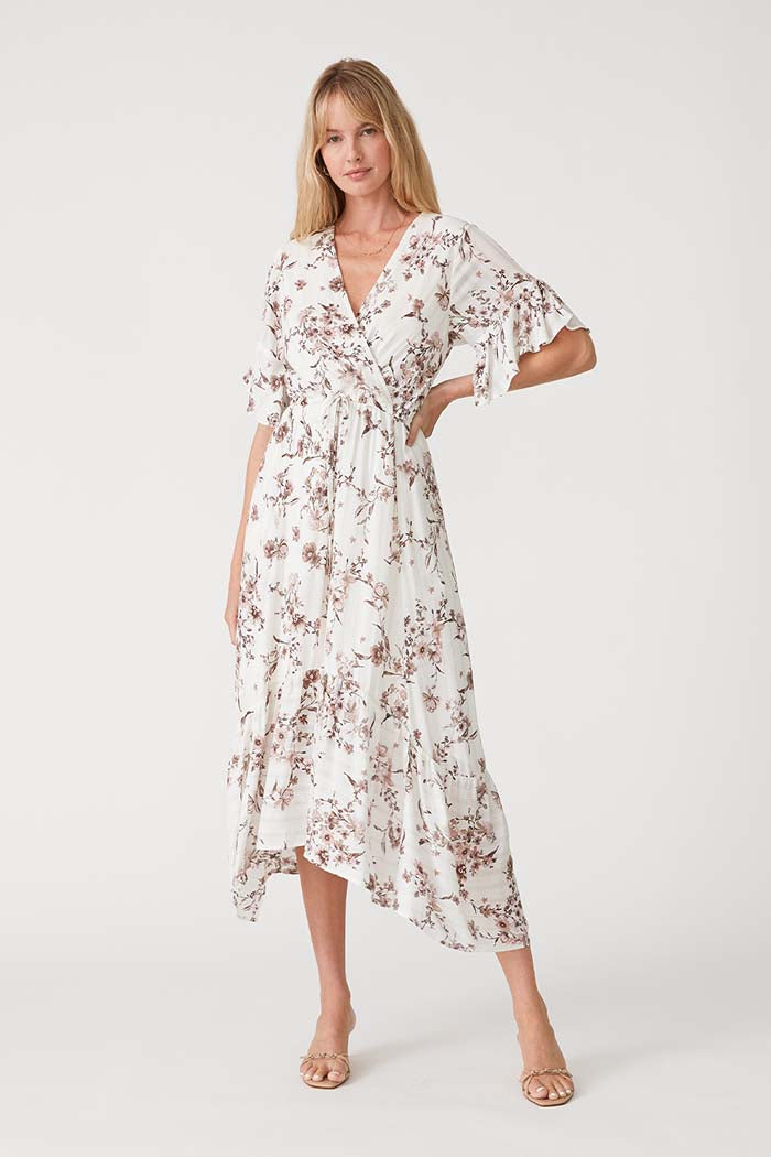 Floral Metallic Pinstripe Surplice Maxi Dress. Floral maxi dress with metallic pinstripe details. Features a surplice v-neckline, ruffled sleeves, drawstring waist tie, and a curved tiered hem. Lining attached.