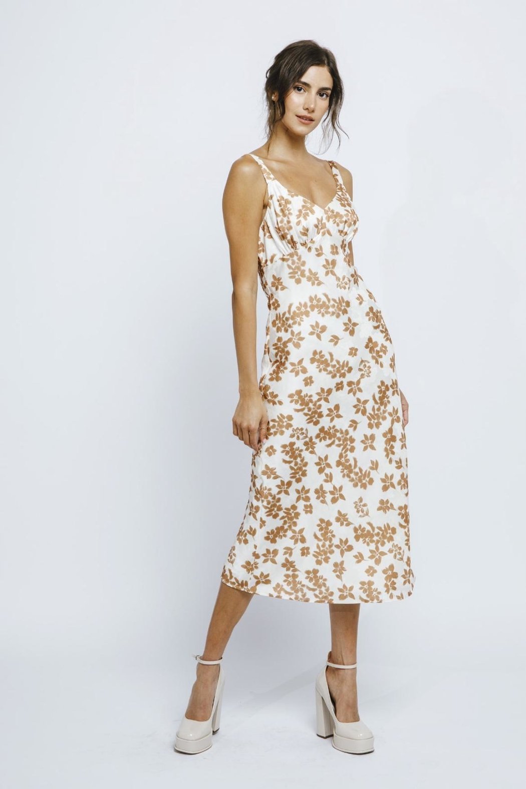 The slip midi dress features a floral print, V-neckline, gathering under the bust, inverted V empire waist, a fitted silhouette, a back zipper, and thick straps. Model is wearing a size Small