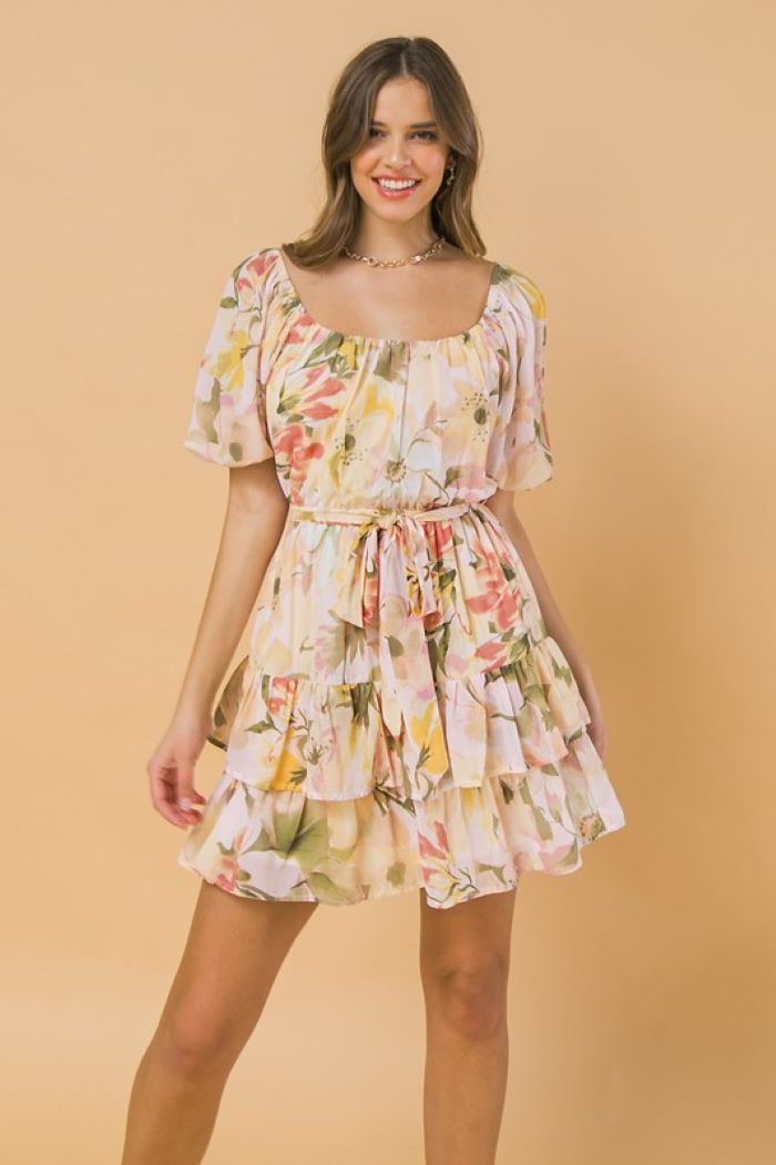 Flower Garden mini dress with square neckline, ruffle layered skirt, ribbon tie Waist and bubble sleeves.