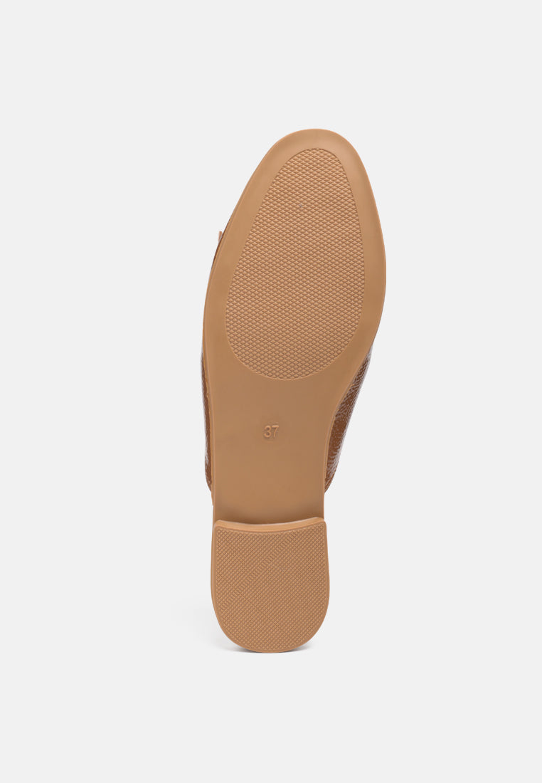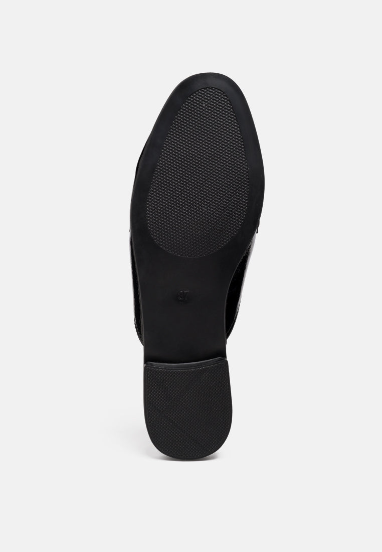 Almond Toe Mules with classic fringes and high quality metal chain buckle on top. The flat shoe is for both casual and semi-casual dressing needs.
