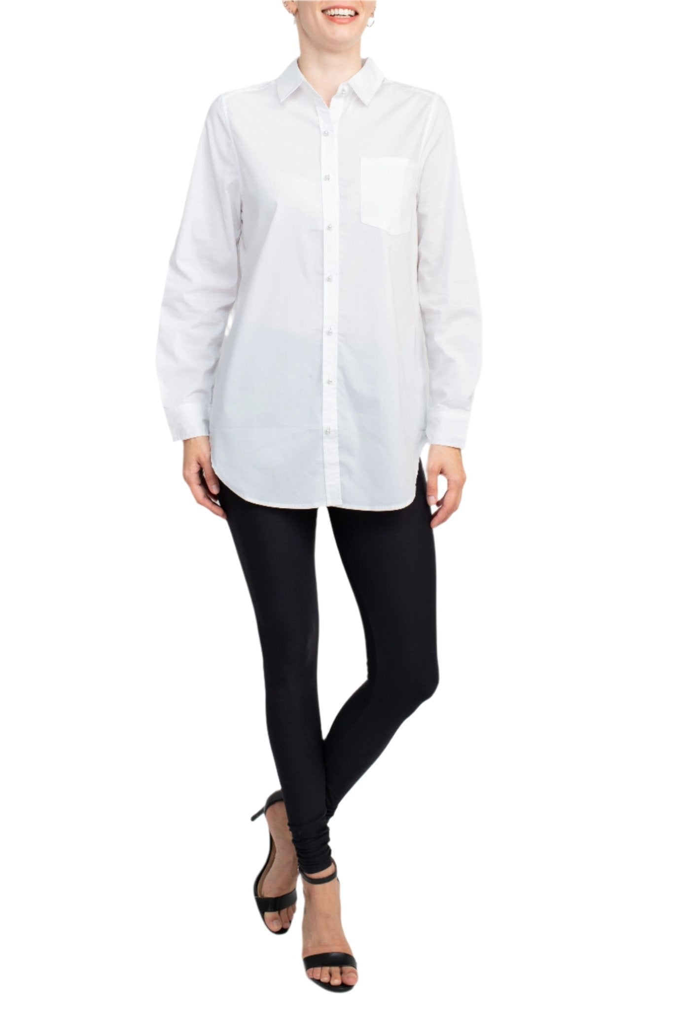 Its crisp white hue and flattering drape make it a go-to for dressy daywear, and the machine-washable fabric ensures you can wear it again and again with ease.