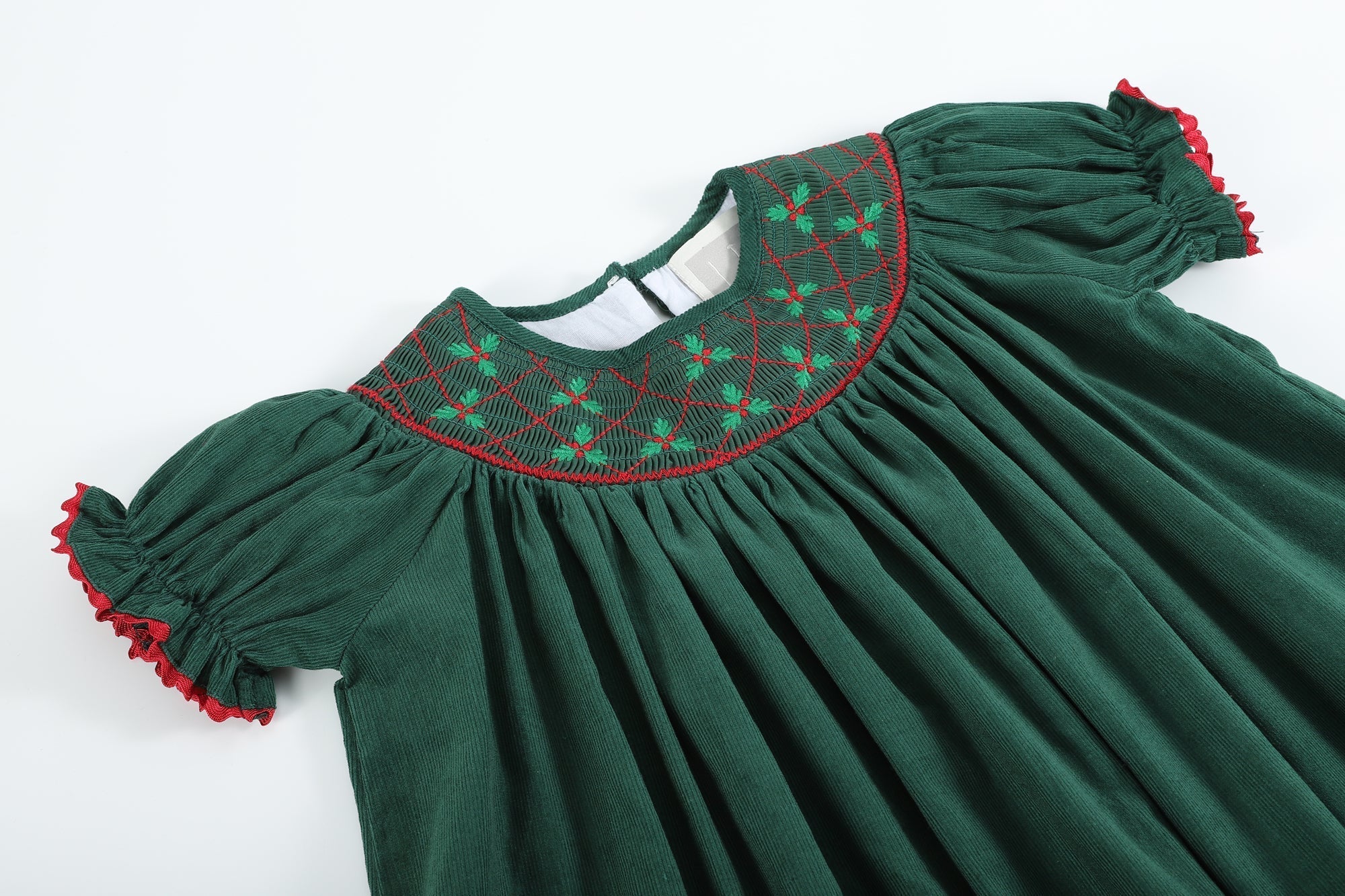 Stunning and Sweet! This beautiful green dress by Lil Cactus features pretty mistletoe embroidery, smocking, and red trim. Made in a 100% soft cotton ensure you little sweetie is comfortable all day long. This Bishop dress is the traditional length with hemline reaching the calf/ankle. A stunning outfit for your cutie and all of her christmas fun. From twirling and dancing the day away to holiday parties with family; no matter the occasion she will be looking picture-perfect!