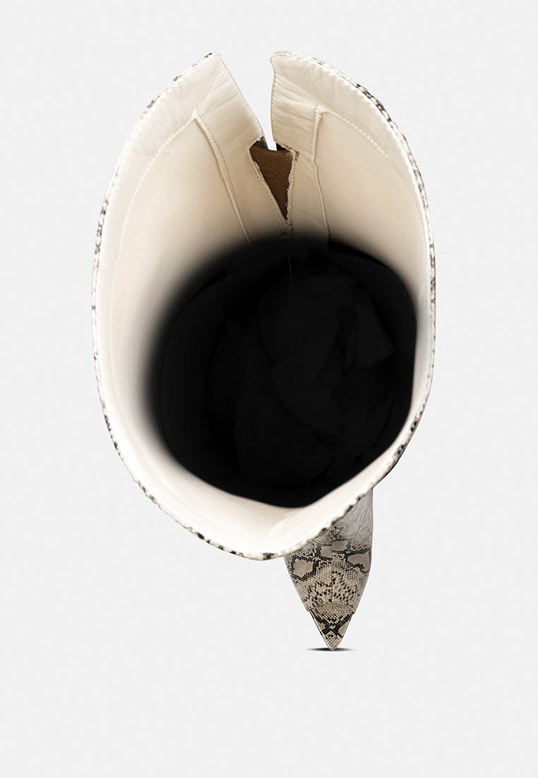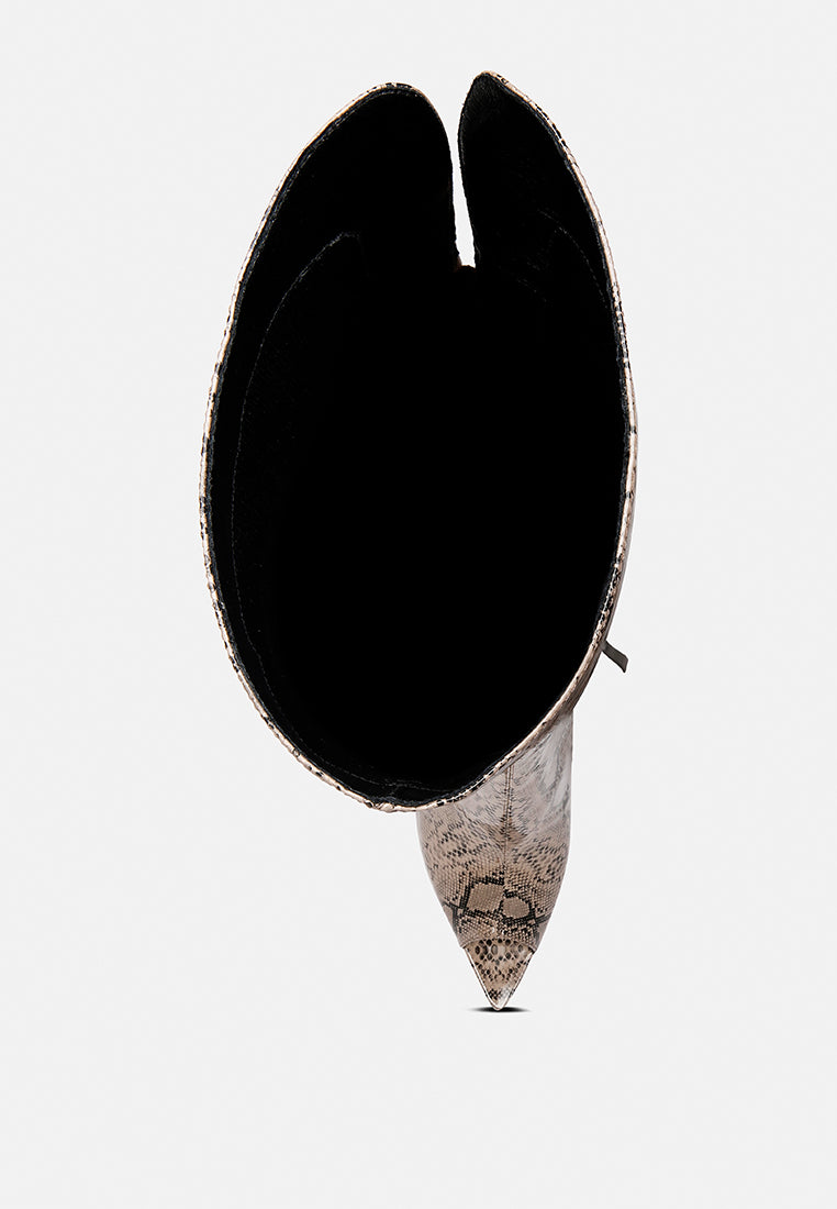 Wearing these stunning long heel boots with a snake print will make you stand out from the crowd. The all-over pattern is striking and distinctive, the heels will boost your confidence and the side zipper opening makes it easy to wear. Whether you're dressing up for a night out or just adding some flair to your everyday wardrobe, these boots are a necessity.