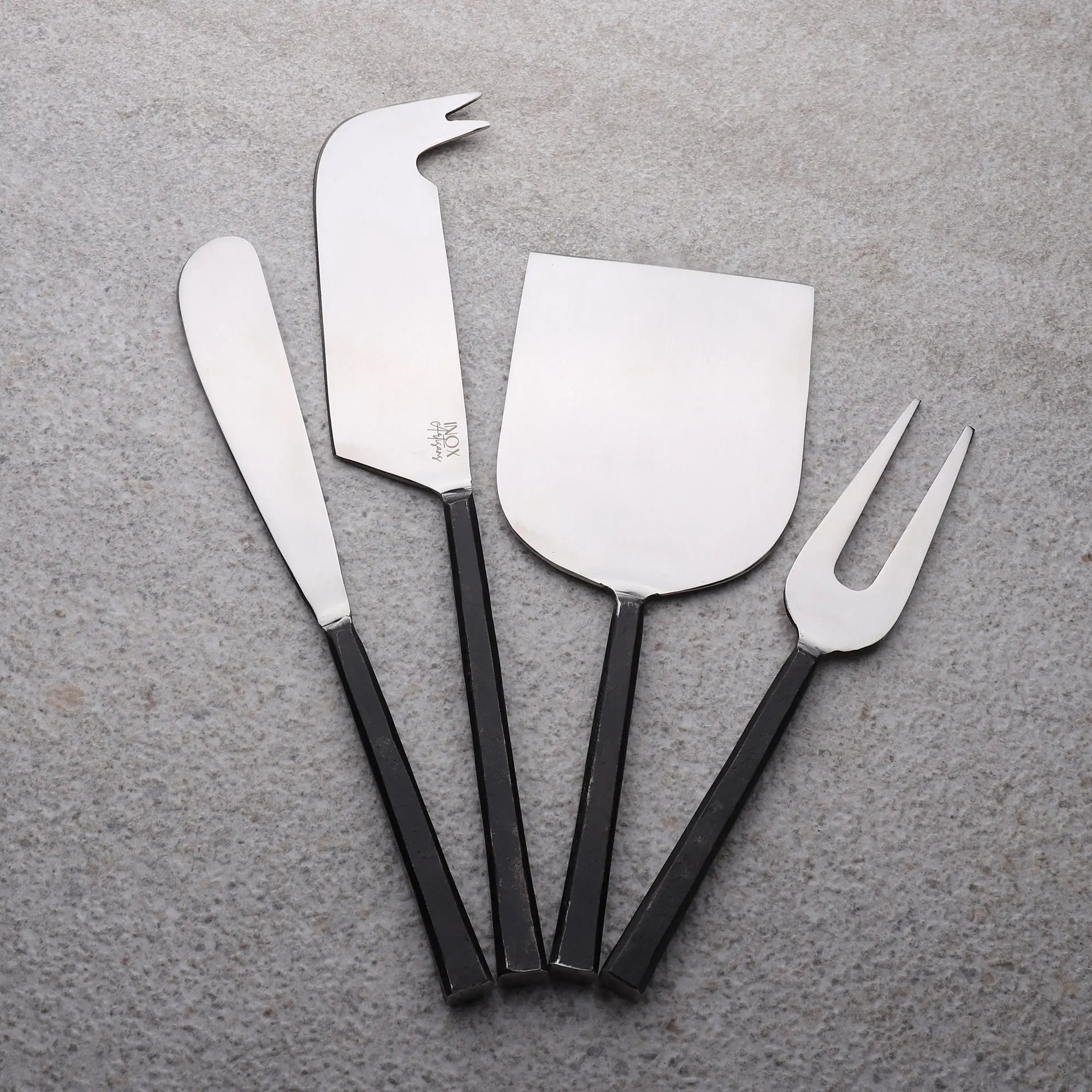 • Set includes one of each: 1 flat cheese knife, 1 cheese spreader, 1 pronged cheese knife, and 1 cheese fork
