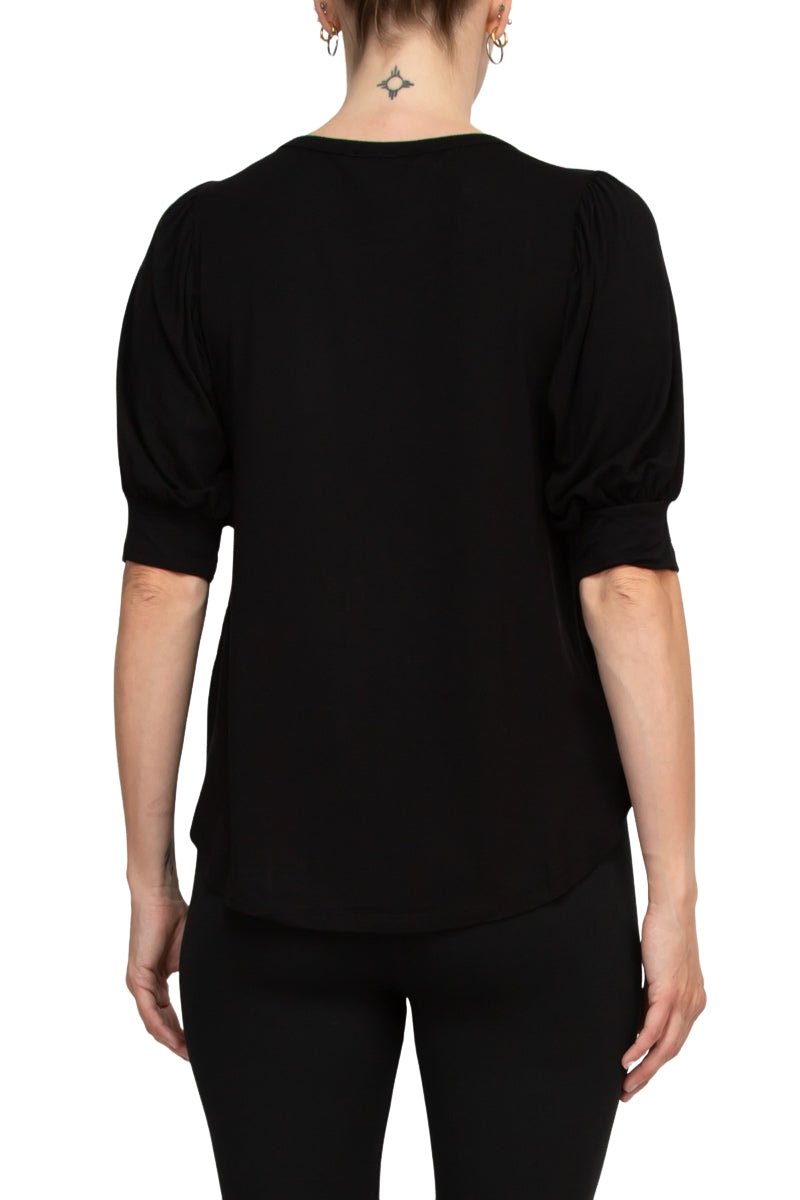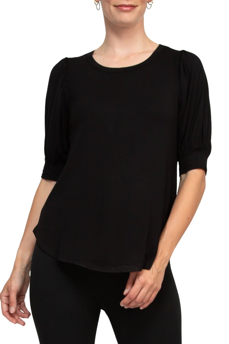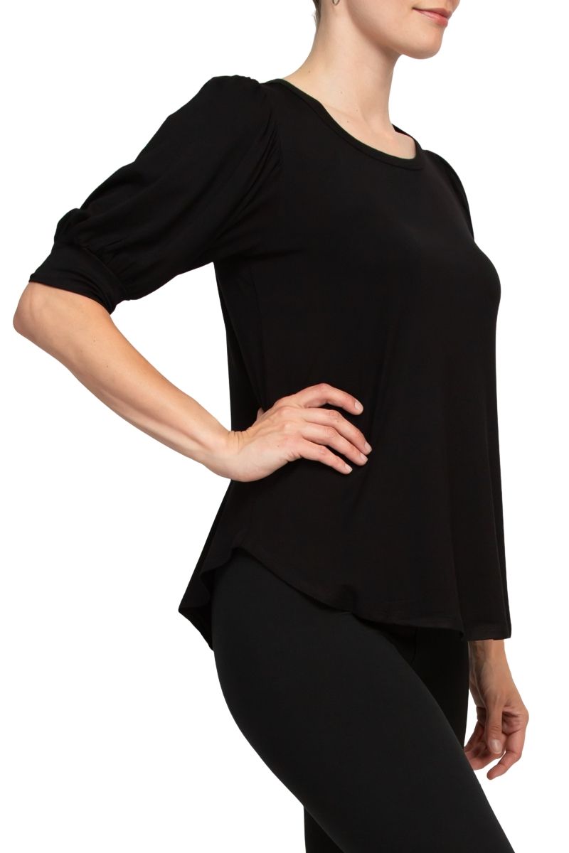 Why Choose the Joan Vass NY Scoop Neck Short Shirred Sleeve Solid Shirttail Hem Blouse?