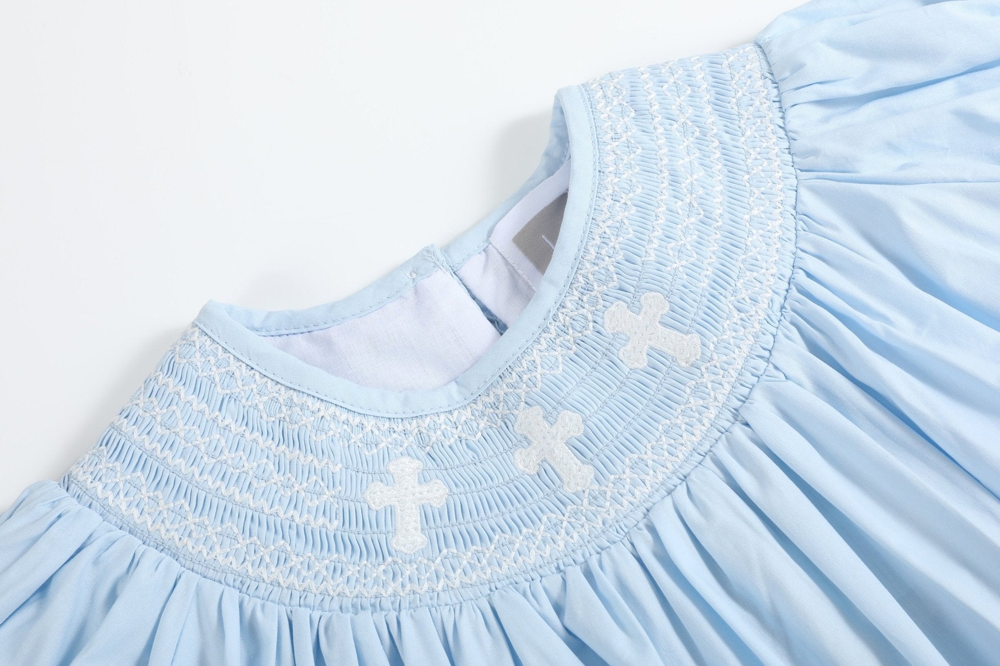 This beautiful Light Blue Crosses Smocked Bishop Dress features a delicate smocked neckline and embroidered crosses. The light blue hue and crisp white trim add an extra touch of elegance. Perfect for any special occasion, this dress effortlessly blends comfort and sophistication, ensuring your little girl stands out with timeless beauty.