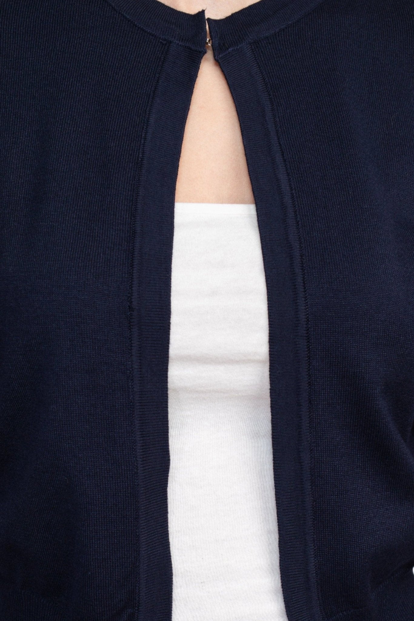 Crafted from a soft and stretchy knit blend (70% Rayon, 30% Polyester) with a delicate lace back (89% Nylon, 11% Spandex), this bolero combines comfort and elegance. The crew neckline and open front design offer a modern, refined silhouette, while the hook-and-eye closure provides a sleek, tailored fit when fastened. The intricate lace back detail adds a touch of femininity and sophistication, making this piece a perfect balance of classic and contemporary style.