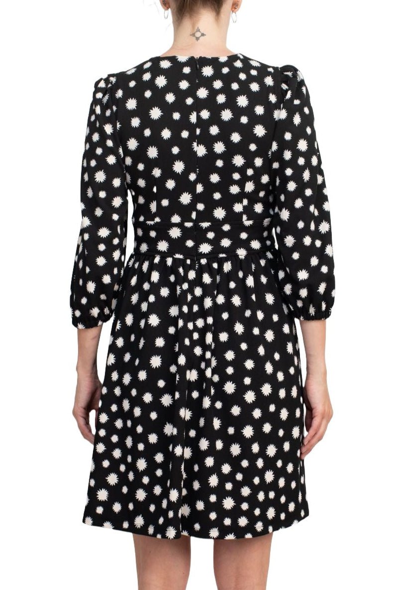 The crew neckline provides a clean and classic silhouette, while the pleated skirt and banded waist beautifully accentuate the figure. The elastic-cuffed 3/4 sleeves add a touch of elegance and comfort, offering a polished look without restricting movement. A hidden zipper back closure ensures a smooth finish, while the multi-print design brings vibrant charm to your wardrobe.