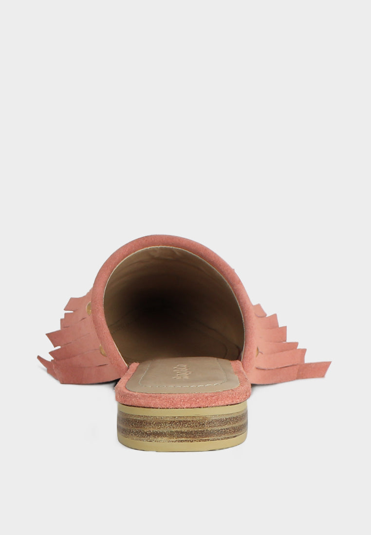 Suede mules with fringe detail and studs are the perfect blend of classic style.
