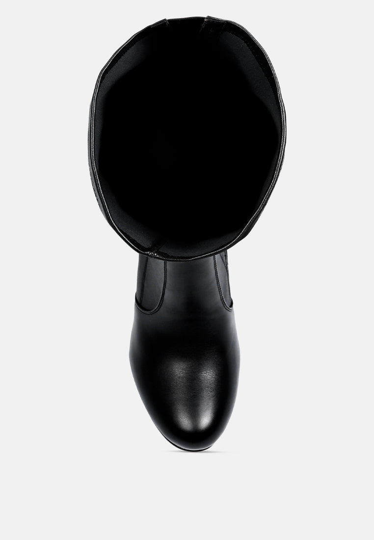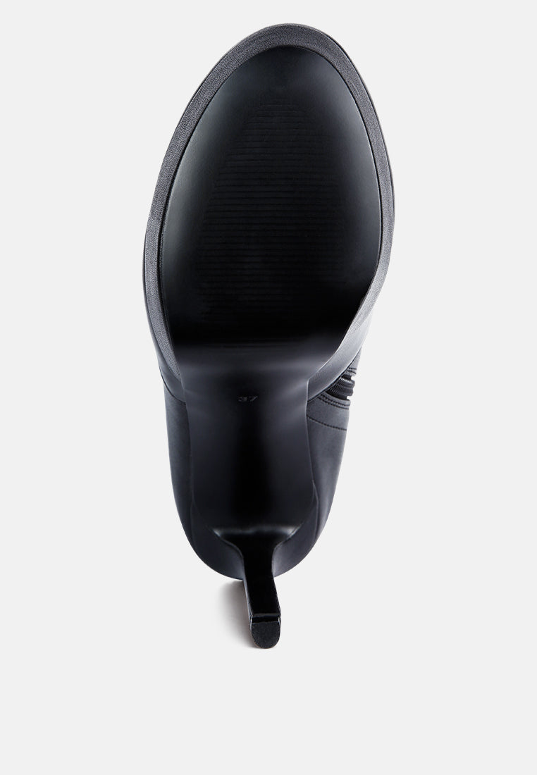High Platform pointed toe stiletto booties come with multi-panel construction which offers flexibility and sets on the foot along the body curves very well. The long over-the-knee boots come with elastic gussets on top, at the back. It has a side zipper opening which facilitates wearing.