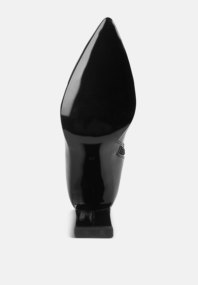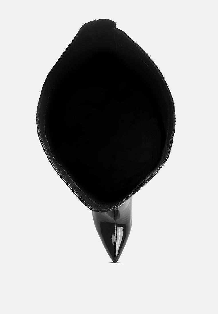 The patent PU long boots are beautiful with a pointed toe and high heel stilettos. The classy and sharp look with the long length makes an intriguing impression. The slim block heeled boots are a must-have with their light cushion insoles!
