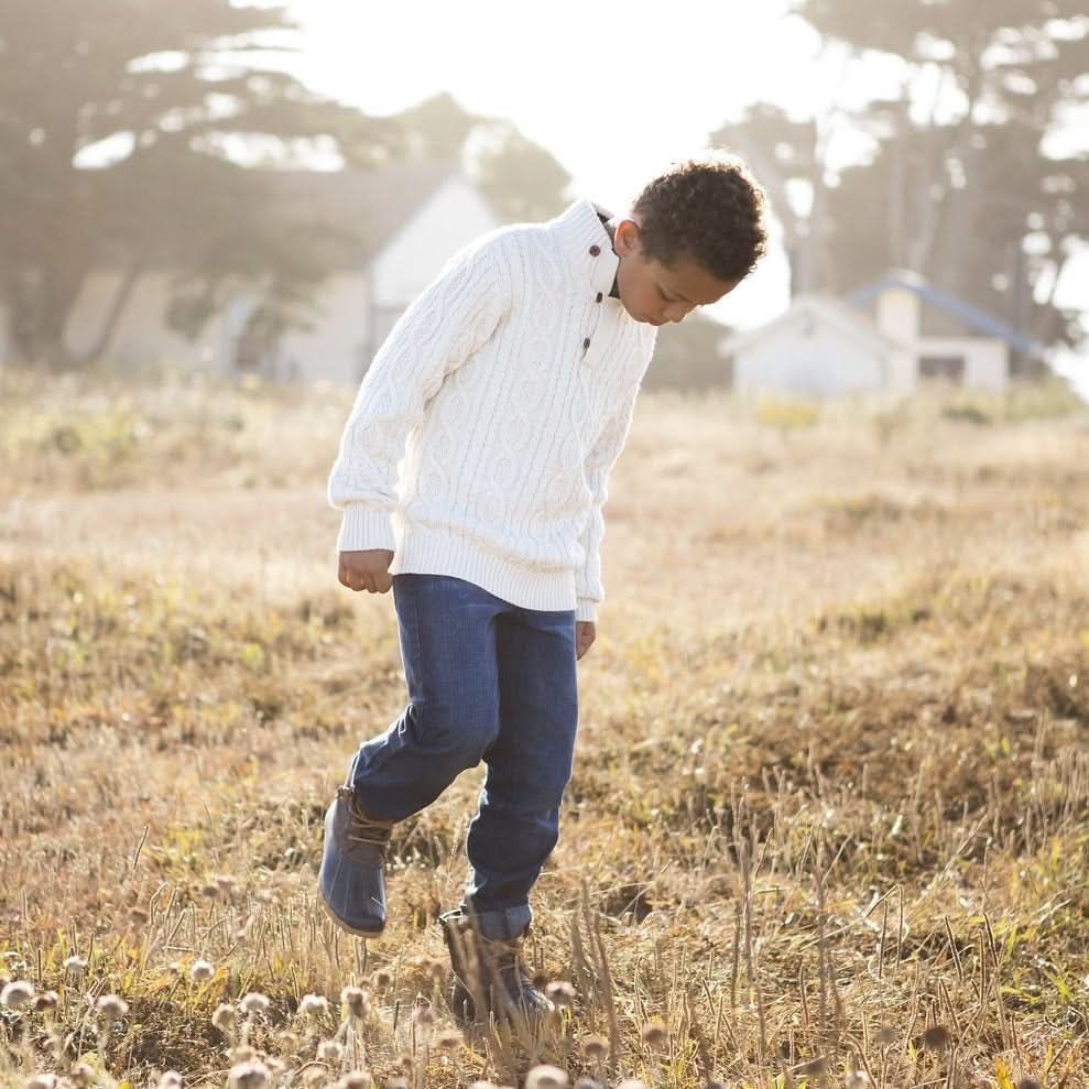 Luxuriously plush cables in our signature 100% organic cotton make this sweater a must have for cooler months. Features a rib knit shawl mock neck with faux leather buttons and fully adorned with a sophisticated cable knit.